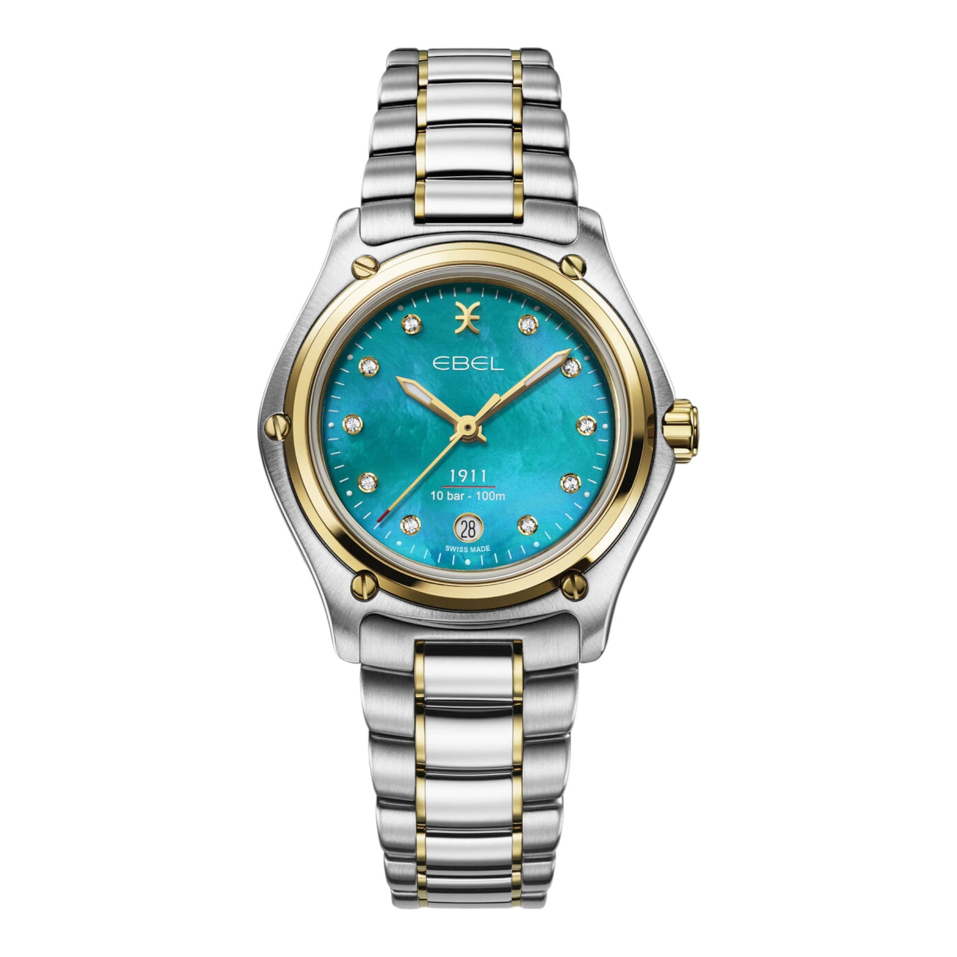 Découvrez la montre femme EBEL 1911, un modèle élégant avec boîtier en acier inoxydable et or jaune 18K, Ø 30mm. Cadran en nacre turquoise profond avec 10 diamants (0.052ct), fenêtre de date à 6h, bracelet à maillons bicolores et mouvement quartz suisse. Étanchéité jusqu’à 10 bar. • Boîtier : Acier inoxydable et or jaune 18K, diamètre de 30mm. La montre femme EBEL 1911 est un modèle d’élégance et de raffinement, combinant un boîtier en acier inoxydable et or jaune 18K de 30mm de diamètre avec un cadran en nacre turquoise profond orné de 10 diamants (0.052ct). Ce cadran unique est rehaussé par une fenêtre de date à 6h, ajoutant une touche pratique et moderne à son design classique. La nacre turquoise apporte une dimension de couleur et de profondeur, tandis que les diamants ajoutent une touche de luxe et de sophistication. Le bracelet en acier inoxydable bicolore à maillons est à la fois élégant et confortable, complété par un fermoir à clip pour une sécurité optimale. Le cristal de saphir avec traitement antireflet sous-jacent assure une lisibilité parfaite en toutes circonstances. Propulsée par un mouvement quartz suisse, cette montre garantit une précision sans faille. De plus, son étanchéité jusqu’à 10 bar la rend idéale pour une utilisation quotidienne, y compris lors de vos activités aquatiques. |