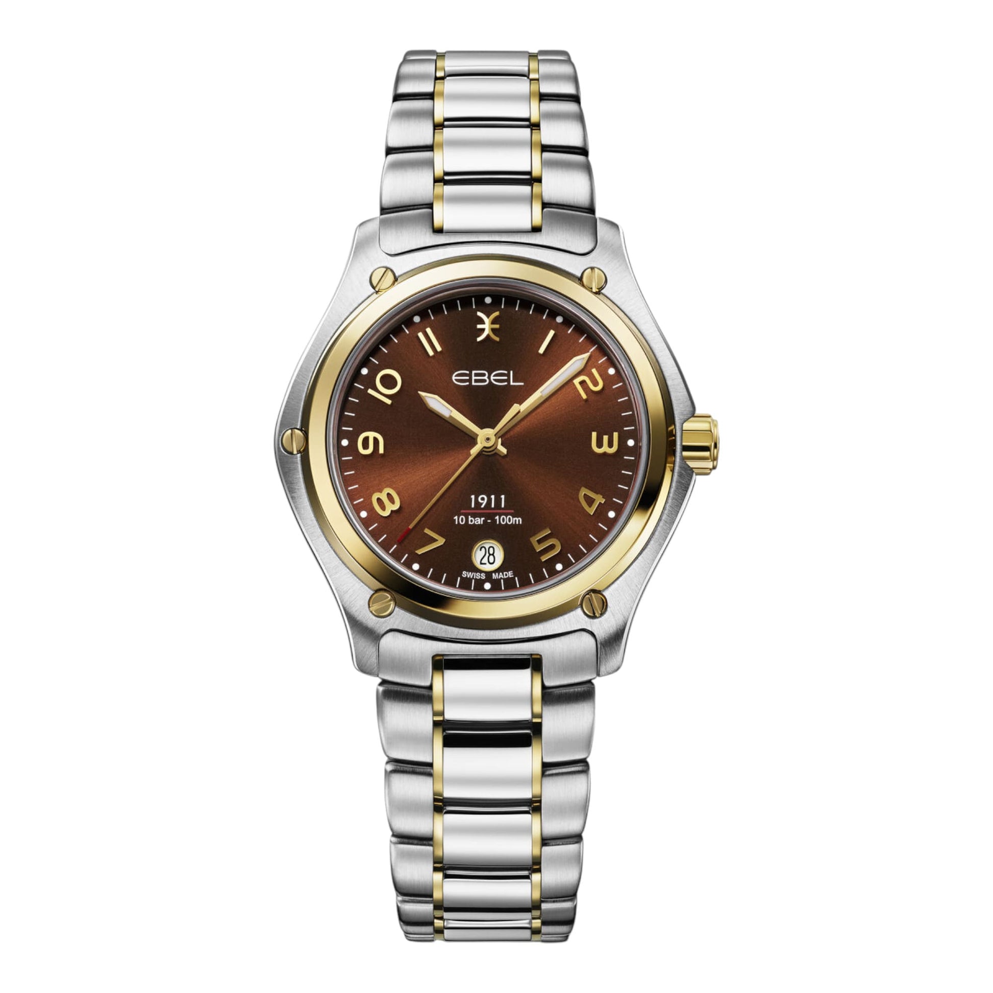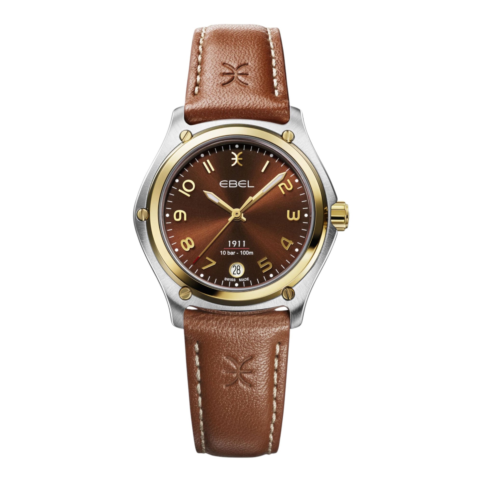 La montre femme EBEL 1911 arbore un boîtier de 34 mm en acier inoxydable et or jaune 18 ct, mettant en valeur un cadran en nacre ocre rehaussé de 10 diamants (0,065 ct) et d’un guichet date situé à 6 heures pour un style sophistiqué et fonctionnel. La glace saphir avec traitement antireflet en dessous assure une lisibilité optimale. Son bracelet en acier avec maillons bicolores et boucle déployante offre un confort raffiné, tandis qu'un second bracelet en tissu, fabriqué à partir de plastique recyclé provenant de l'océan et doublé en liège, vient compléter ce modèle. Animée par un mouvement quartz suisse, cette montre est étanche jusqu'à 10 bars. | |