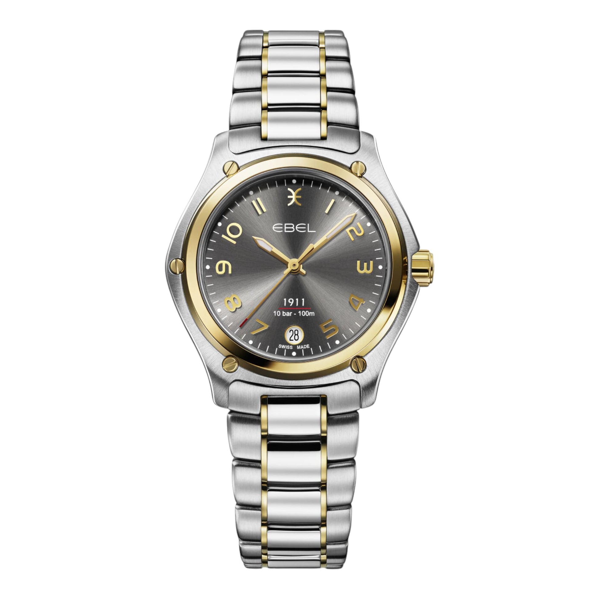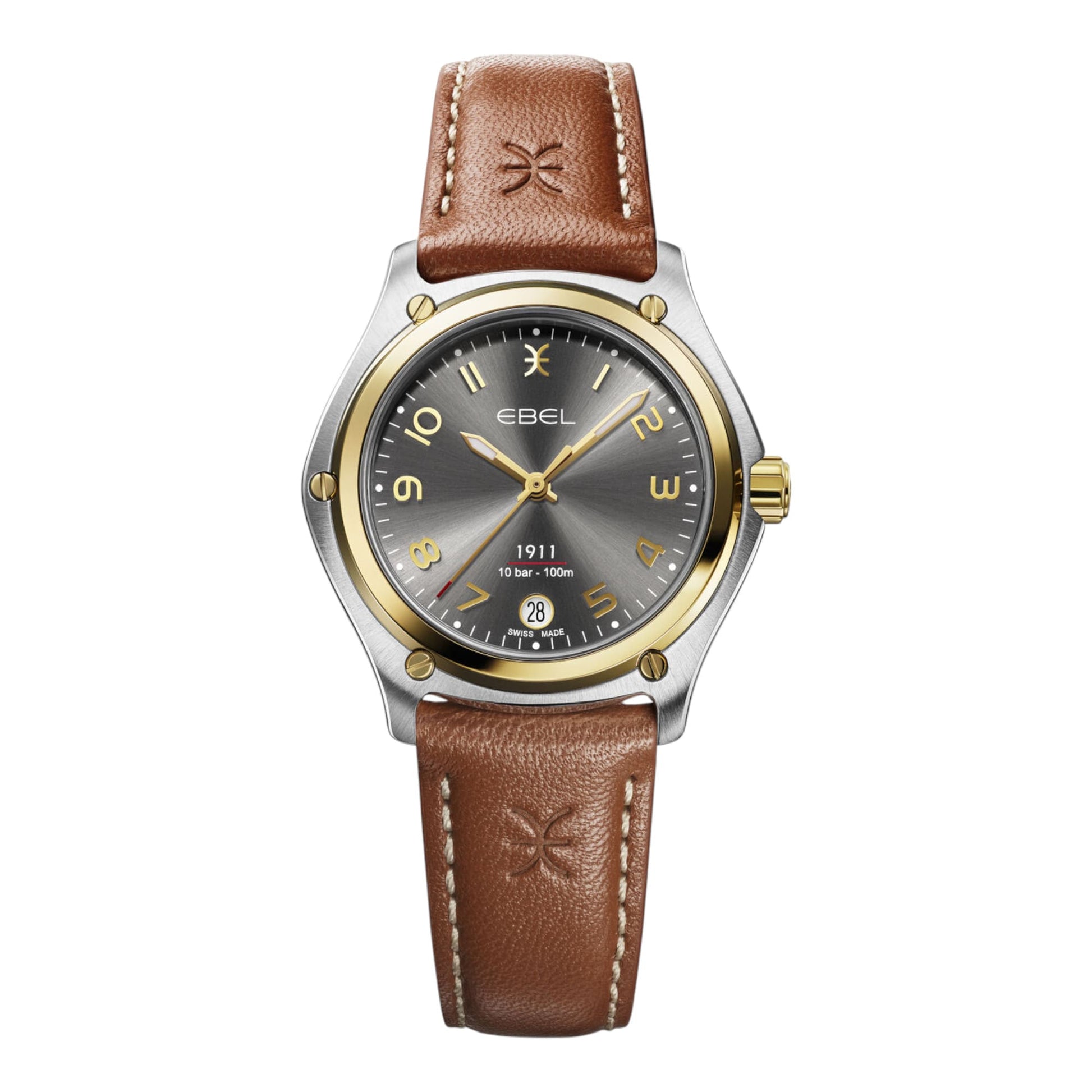La montre femme EBEL 1911 arbore un boîtier de 34 mm en acier inoxydable et or jaune 18 ct, mettant en valeur un cadran en nacre ocre rehaussé de 10 diamants (0,065 ct) et d’un guichet date situé à 6 heures pour un style sophistiqué et fonctionnel. La glace saphir avec traitement antireflet en dessous assure une lisibilité optimale. Son bracelet en acier avec maillons bicolores et boucle déployante offre un confort raffiné, tandis qu'un second bracelet en tissu, fabriqué à partir de plastique recyclé provenant de l'océan et doublé en liège, vient compléter ce modèle. Animée par un mouvement quartz suisse, cette montre est étanche jusqu'à 10 bars. | |