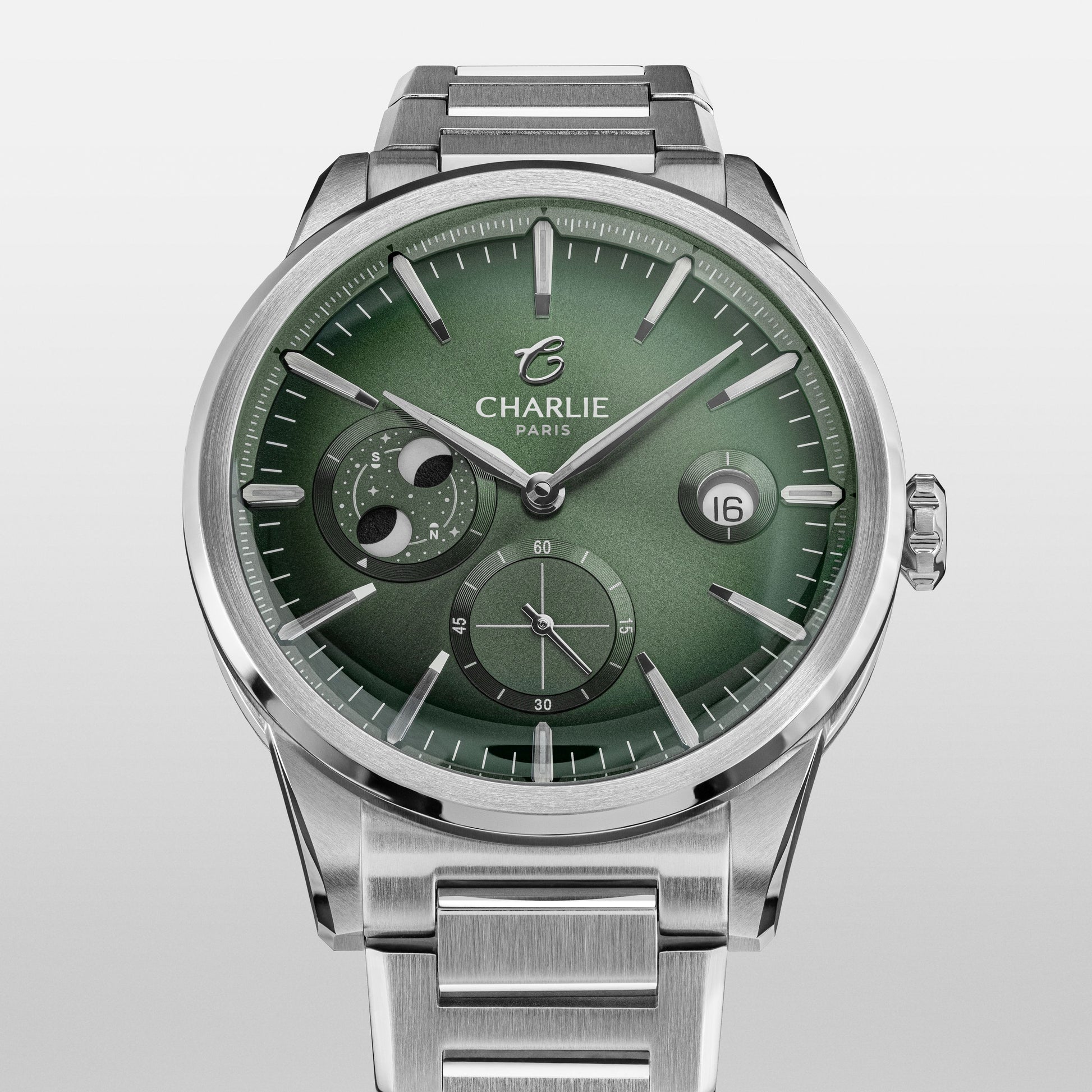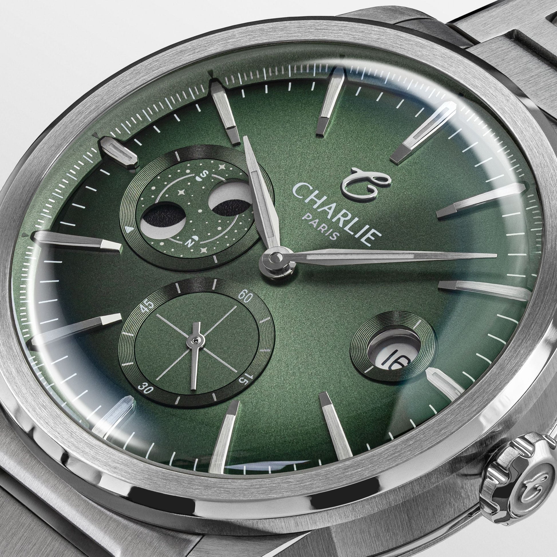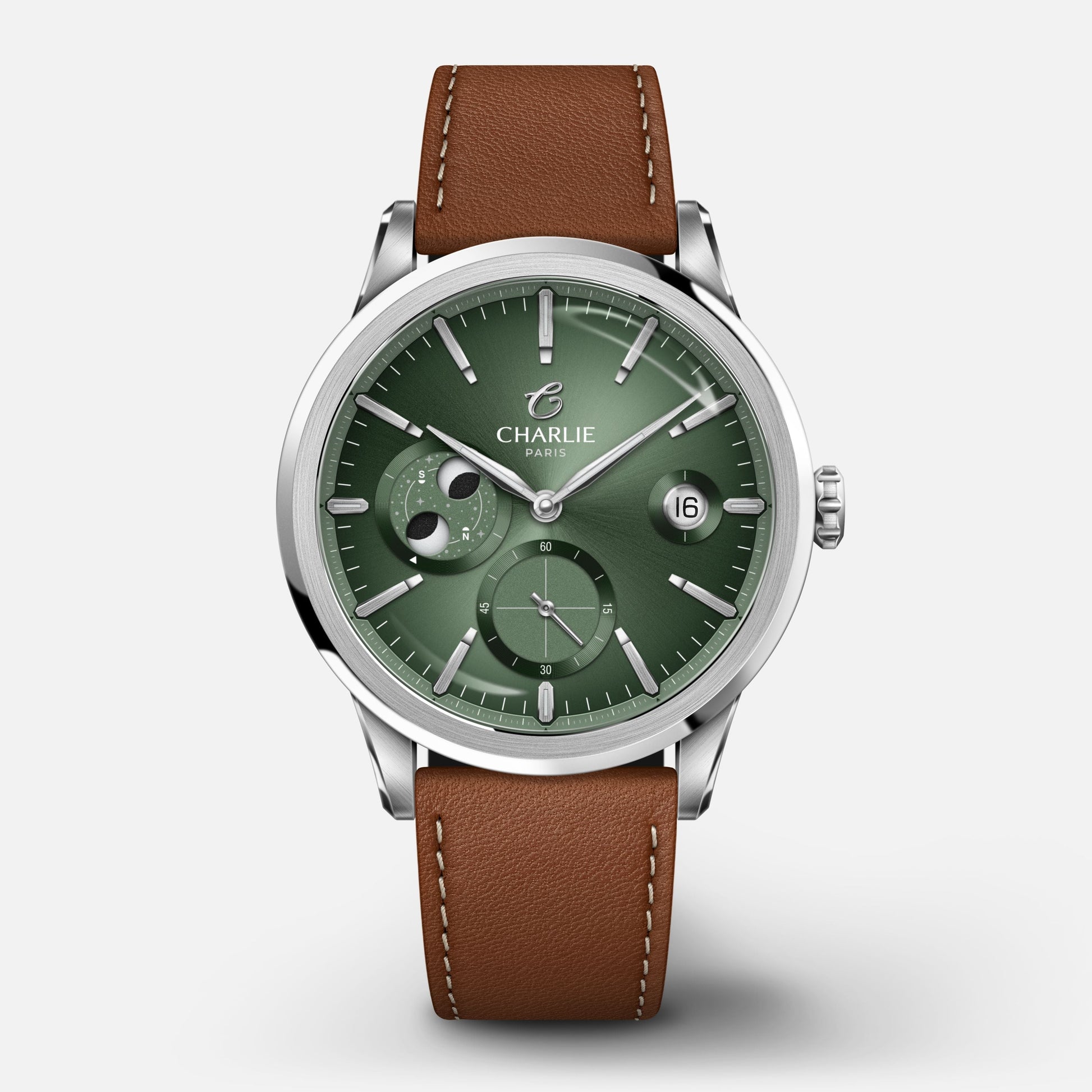 Dessinée et assemblée en France, équipée du mouvement automatique suisse Soprod C105, l'Alliance Phase de Lune s’affirme comme une montre au fort contenu horloger. Dans son boitier en acier ciselé de 39mm de diamètre, cette montre pour homme est dotée de la complication "phase lune perpétuelle". Avec son allure qui dessine un équilibre parfait entre proportions affirmées et contours nets, lignes précises et surfaces texturées, ce garde-temps au cadran vert sauge a été pensé pour accompagner les passionés de montre au style unique et immuable.