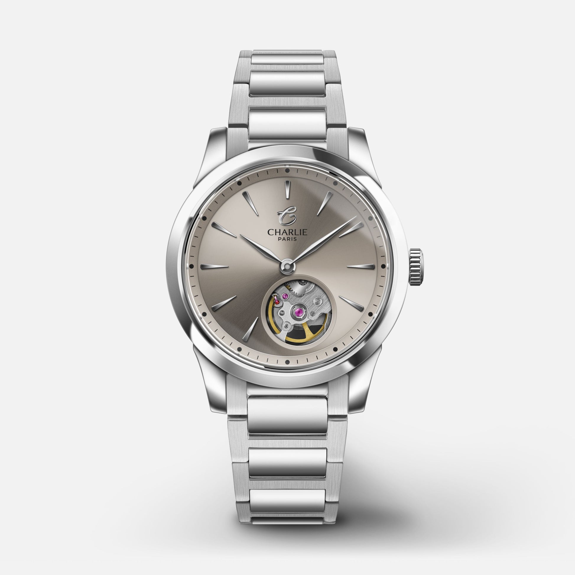 Dessinée et assemblée en France, l'Aurore avec mouvement mécanique automatique et cadran taupe présente des lignes épurées, au design à la fois classique et contemporain. Cette montre étanche 10ATM pour femme flatte les poignets avec son boitier de 34mm de diamètre, son regard discret sur son mouvement, son bracelet en acier poli brossé et ses lignes dynamiques.
