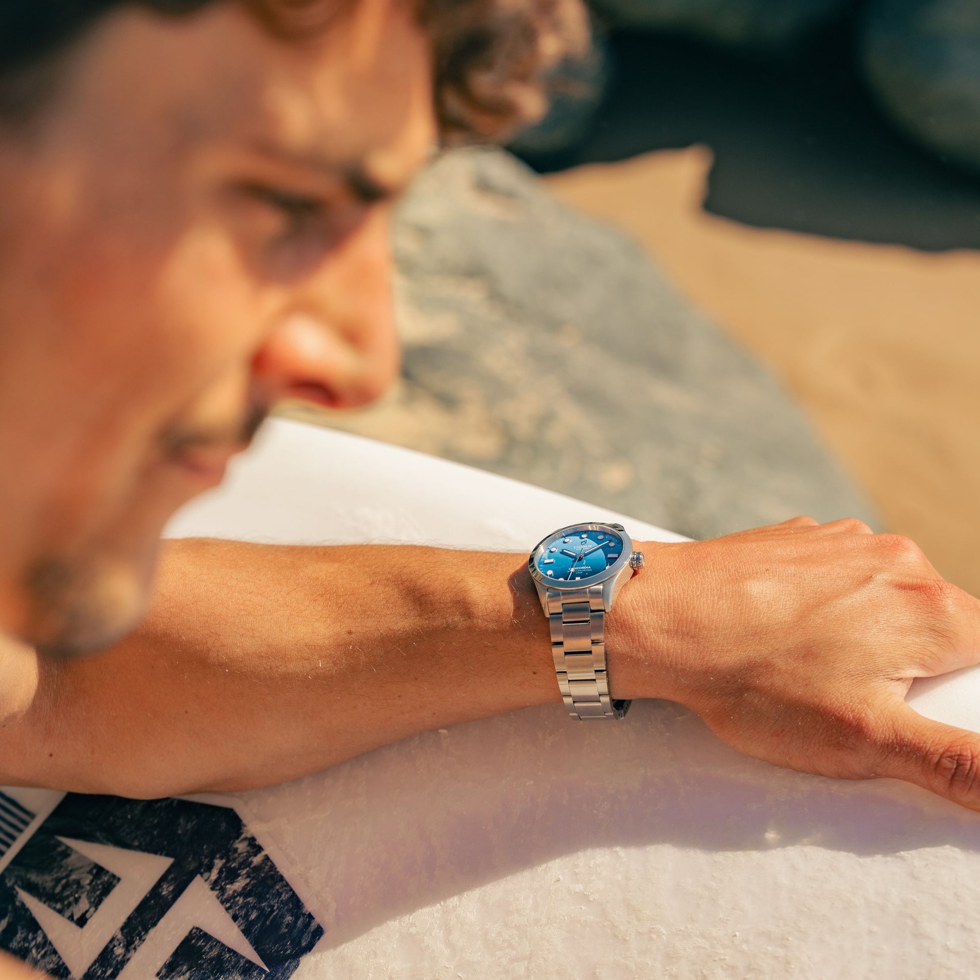 Dessinée et assemblée en France, équipée d'un mouvement quartz sweep second Seiko VH31, étanche à 300m, cette montre pour homme de 38mm de diamètre s’affirme comme un garde-temps sportif au fort contenu horloger. Avec son cadran au dégardé bleu azur, cette montre présente une esthétique aussi bien sportive qu'élégante qui saura séduire les amateurs de sensations fortes pour leur quotidien.