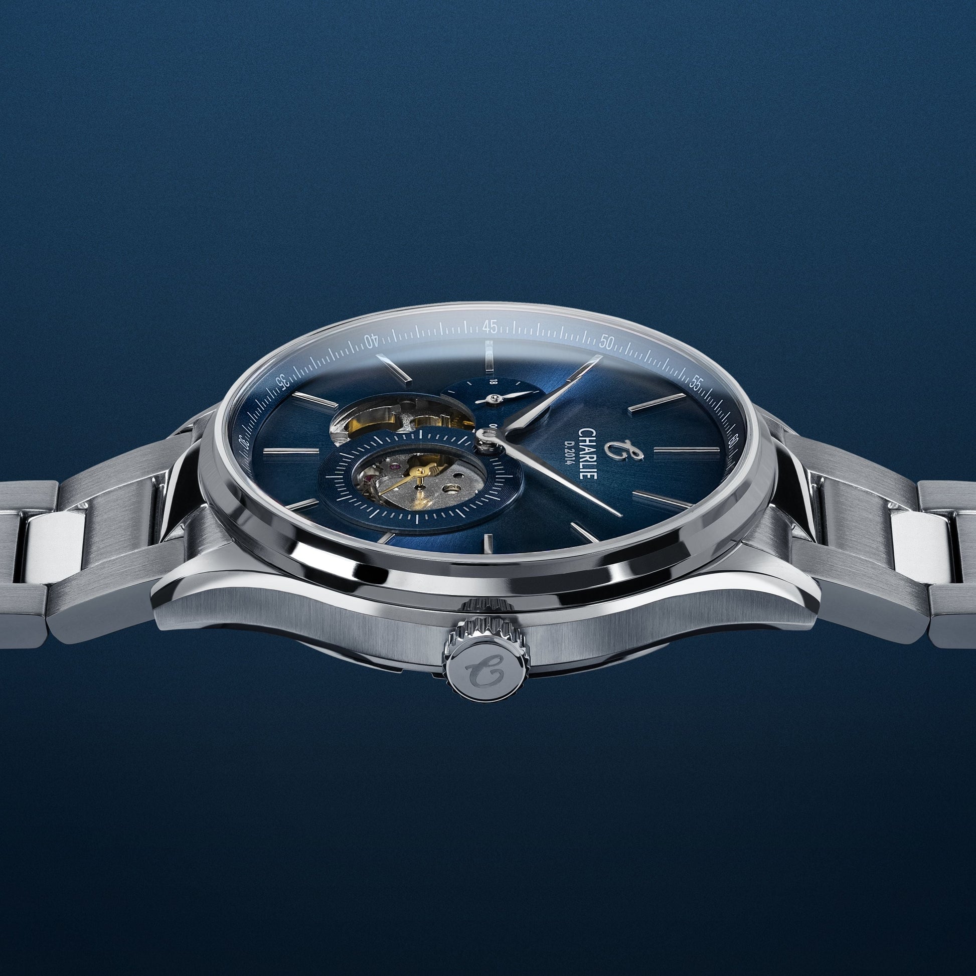 Cette édition anniversaire de notre iconique montre Initial vient célébrer les 10 ans de la maison avec un design complètement restylé, un magnifique cadran bleu soleillé & fumé, et notre nouveau logo signature "C" sous lequel le "D.2014" vient souligner notre date de création. Édition anniversaire limitée à 100 exemplaires.