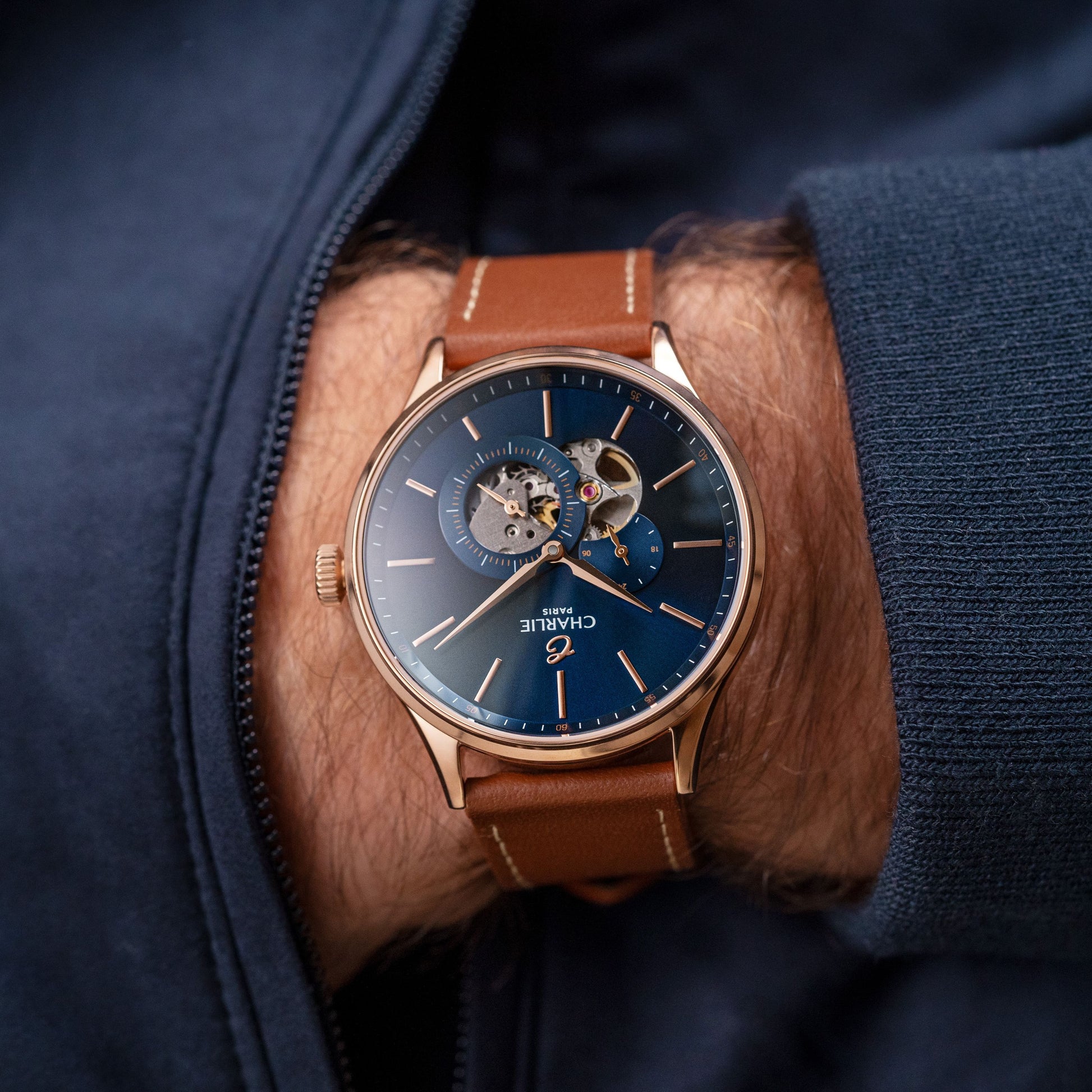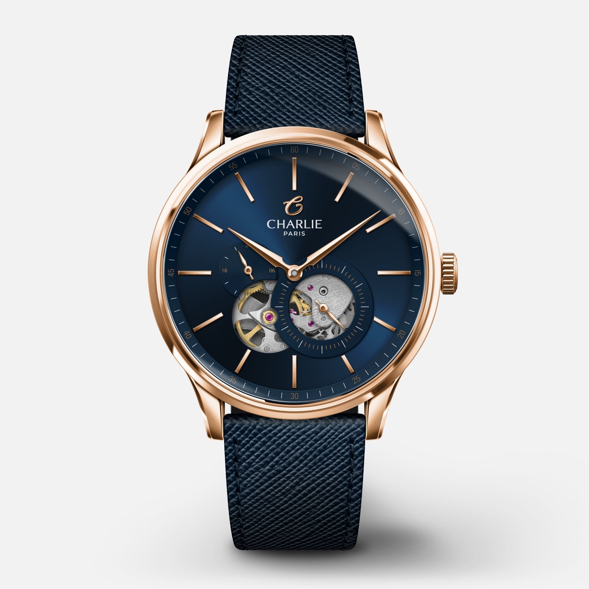 Dessinée et assemblée en France, l'Initial Cœur Ouvert cadran bleu soleillé présente des lignes épurées, au design à la fois classique et contemporain. Cette montre automatique pour homme laisse apparaître les rouages de son mouvement Citizen Miyota Calibre 82S7 pour un équilibre parfait entre beauté intemporelle et mécanique horlogère. Avec son boîtier doré or rose de 40mm de diamètre, son verre saphir et ses bracelets interchangeables, elle saura vous accompagner pendant de nombreuses années.