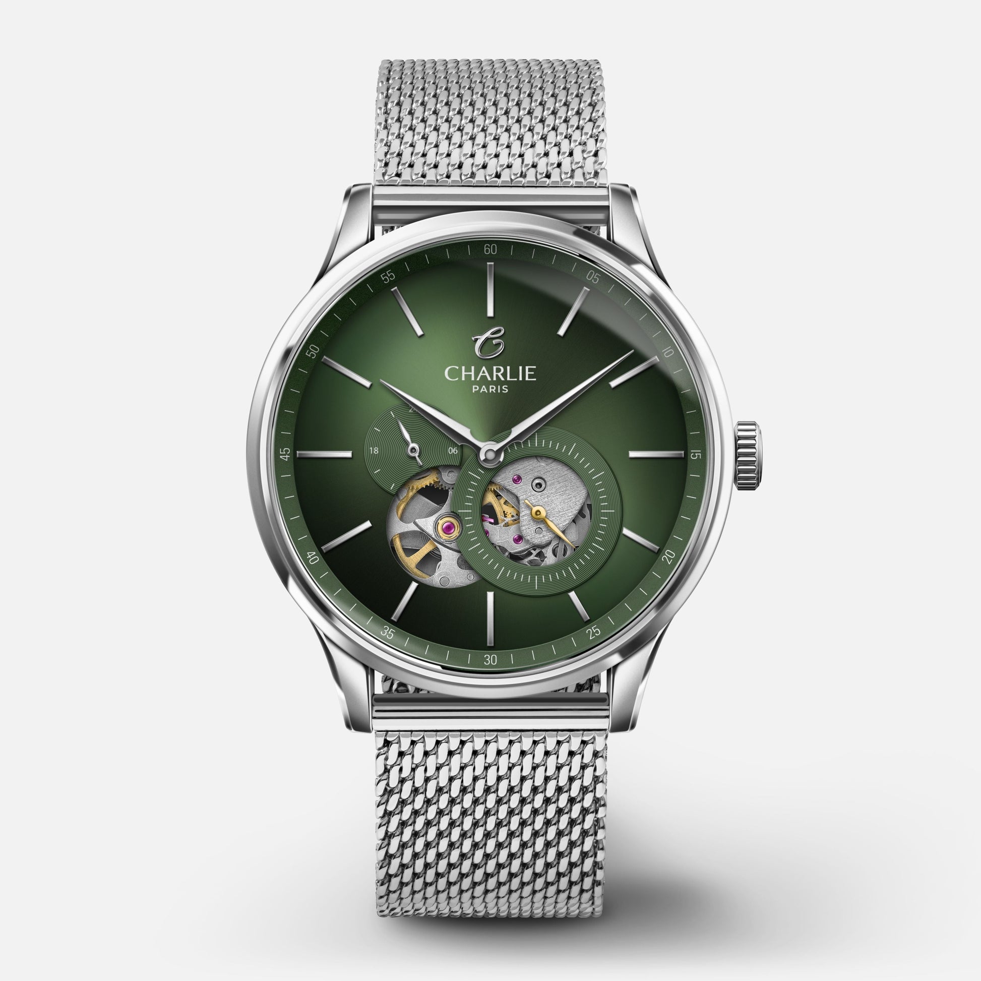 Dessinée et assemblée en France, l'Initial Cœur Ouvert cadran vert sauge soleillé présente des lignes épurées, au design à la fois classique et contemporain. Cette montre automatique pour homme laisse apparaître les rouages de son mouvement Citizen Miyota Calibre 82S7 pour un équilibre parfait entre beauté intemporelle et mécanique horlogère. Avec son boîtier en acier 316L de 40mm de diamètre, son verre saphir et ses bracelets interchangeables, elle saura vous accompagner pendant de nombreuses années.