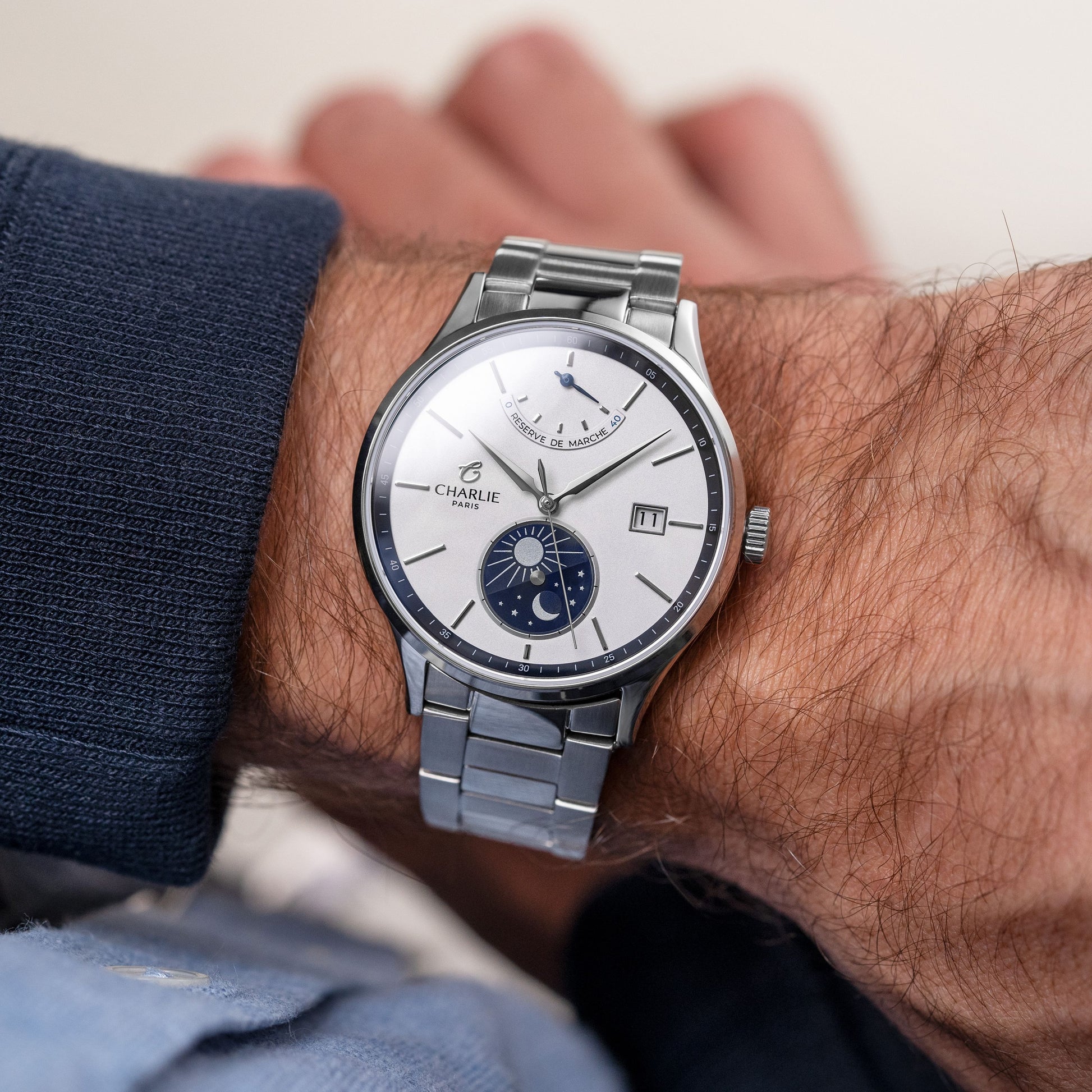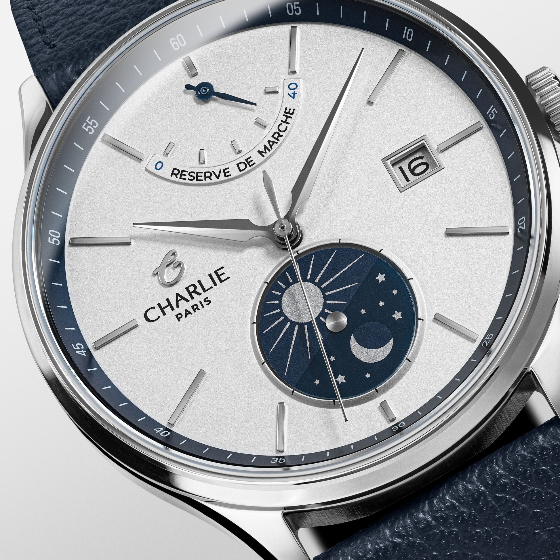 Dessinée et assemblée en France, l'Initial Réserve de Marche cadran blanc et bleu présente des lignes épurées, au design à la fois classique et contemporain. Cette montre automatique pour homme est dotée des fonctions heure, minute, seconde, date, disque jour/nuit et indicateur de réserve de marche pour un équilibre parfait entre beauté intemporelle et mécanique horlogère. Avec son boîtier en acier 316L de 40mm de diamètre, son verre saphir et ses bracelets interchangeables, elle saura vous accompagner pendant de nombreuses années.
