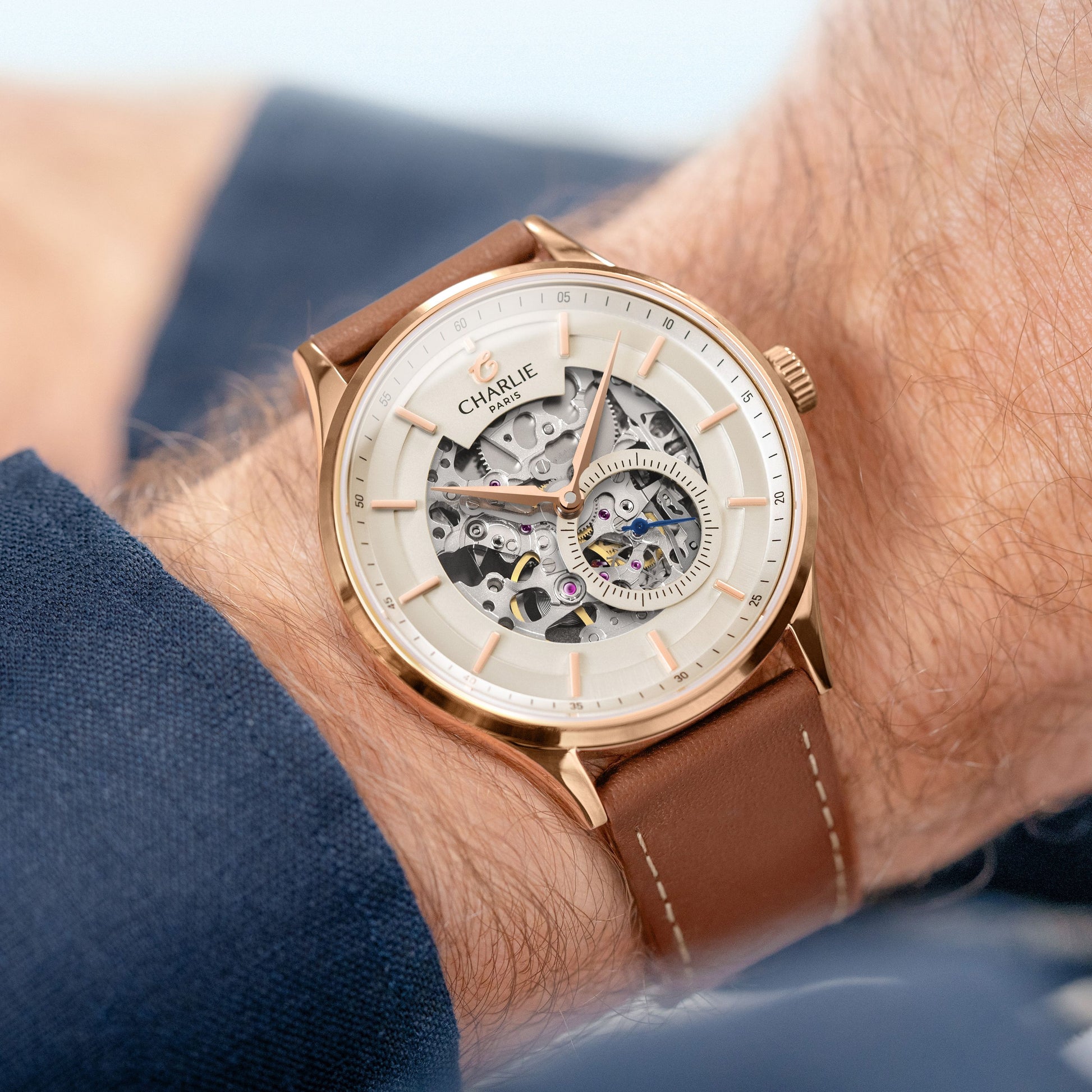Dessinée et assemblée en France, l'Initial Squelette cadran et boitier doré présente des lignes épurées, au design à la fois classique et contemporain. Cette montre automatique pour homme laisse apparaître les rouages de son mouvement pour un équilibre parfait entre beauté intemporelle et mécanique horlogère. Avec son boîtier doré or rose de 40mm de diamètre, son verre saphir et ses bracelets interchangeables, elle saura vous accompagner pendant de nombreuses années.