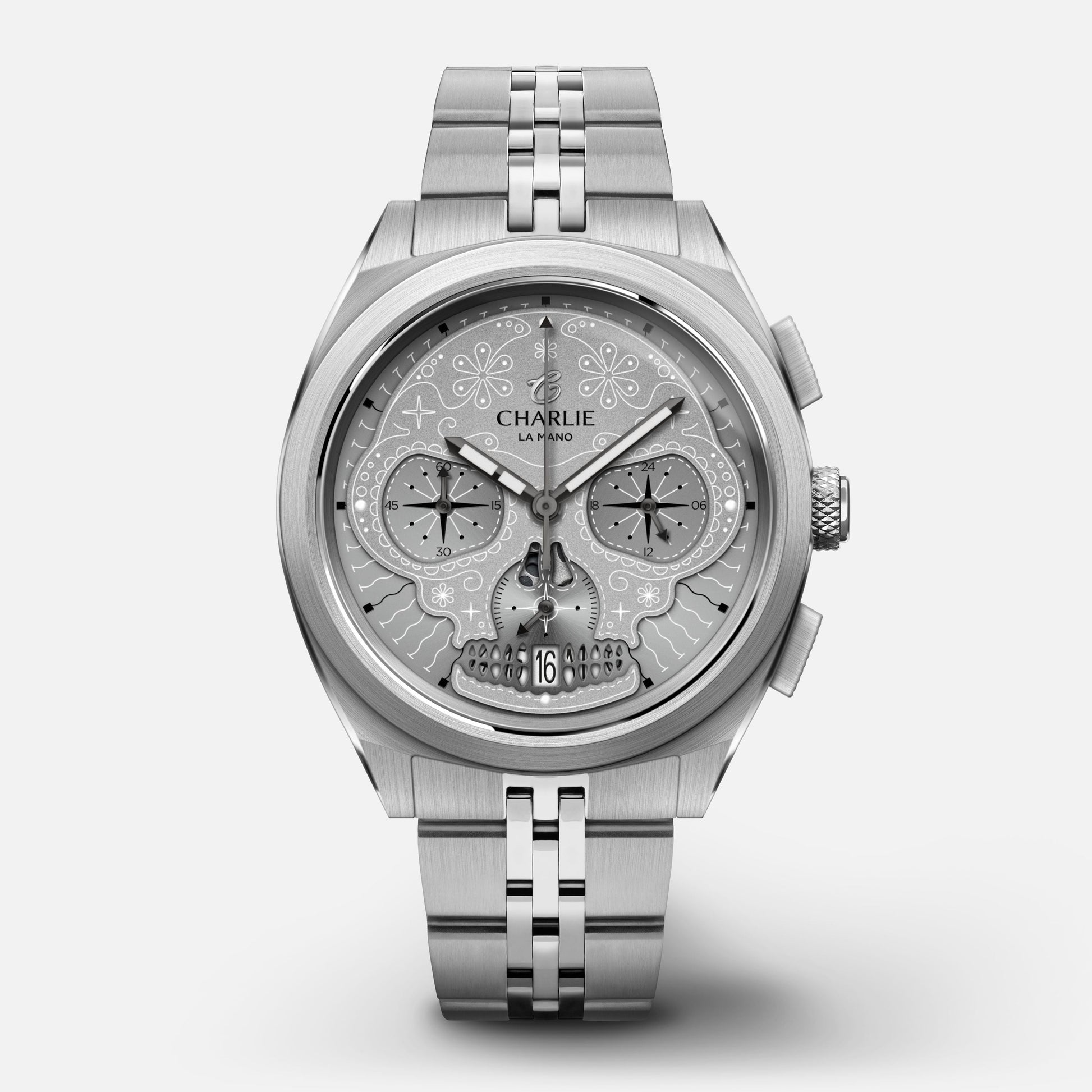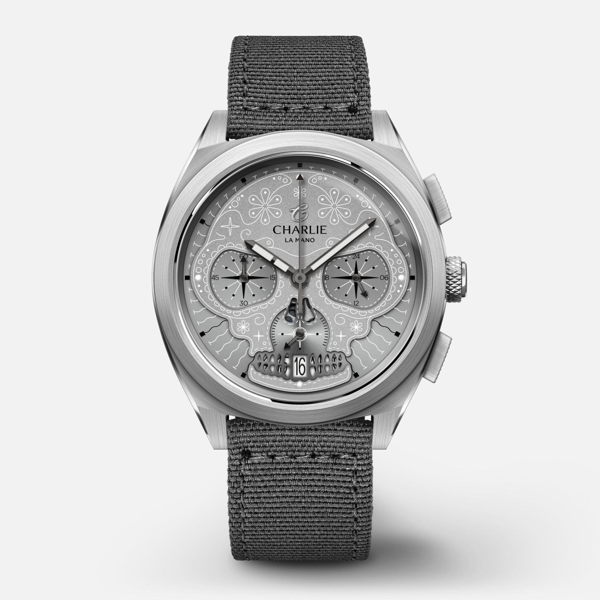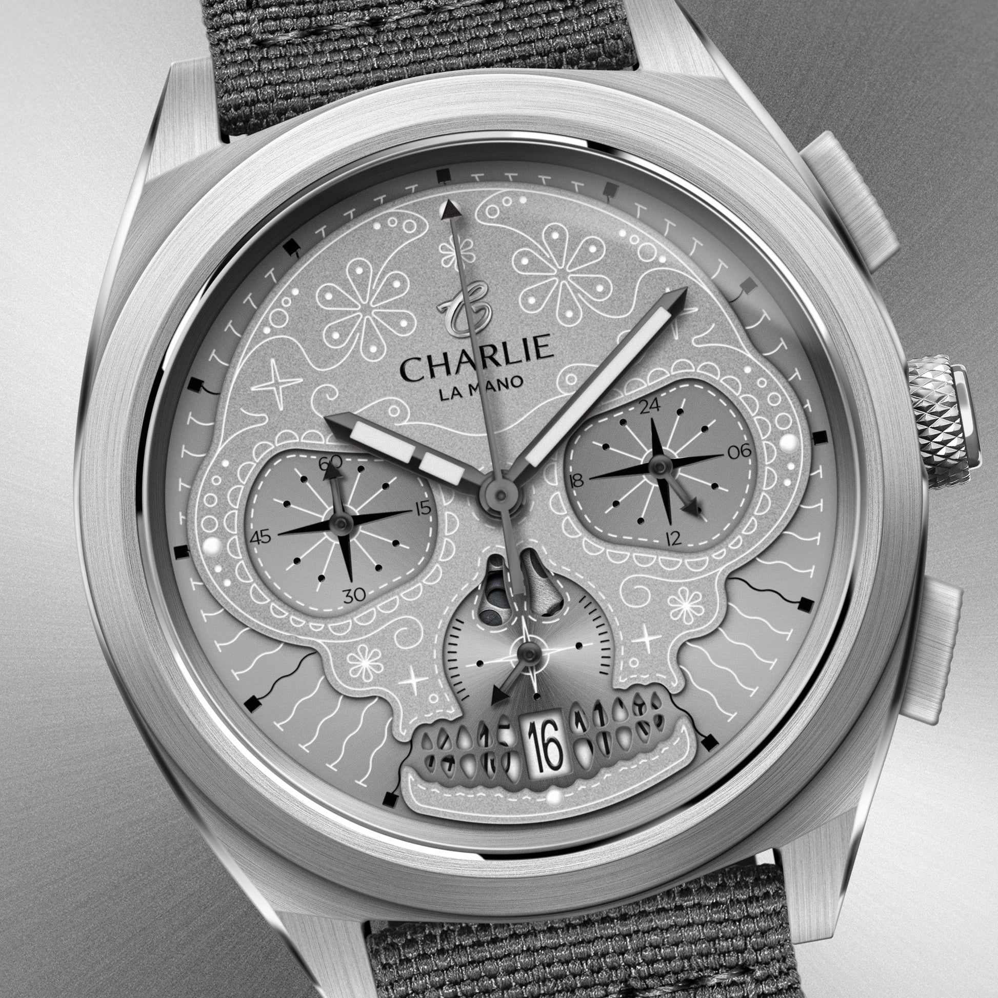 Imaginée en collaboration avec Alexclick, la "GRX - La Mano" affirme la vision contemporaine de la maison Charlie et son goût pour l'innovation créative. Le cadran illustre un graphisme inspiré des Calaveras - tête de mort mexicaine. Le crâne se dessine en volume et se sublime grâce à un ajourage laissant apparaitre la dateur à travers les dents. Le modèle doté d'un mouvement chronographe mecaquartz se compose d'un boitier de Ø39mm étanche à 10ATM, réhaussé d'un verre saphir bombé, et dévoile discrètement en fond de boîte le signe gravé La Mano.