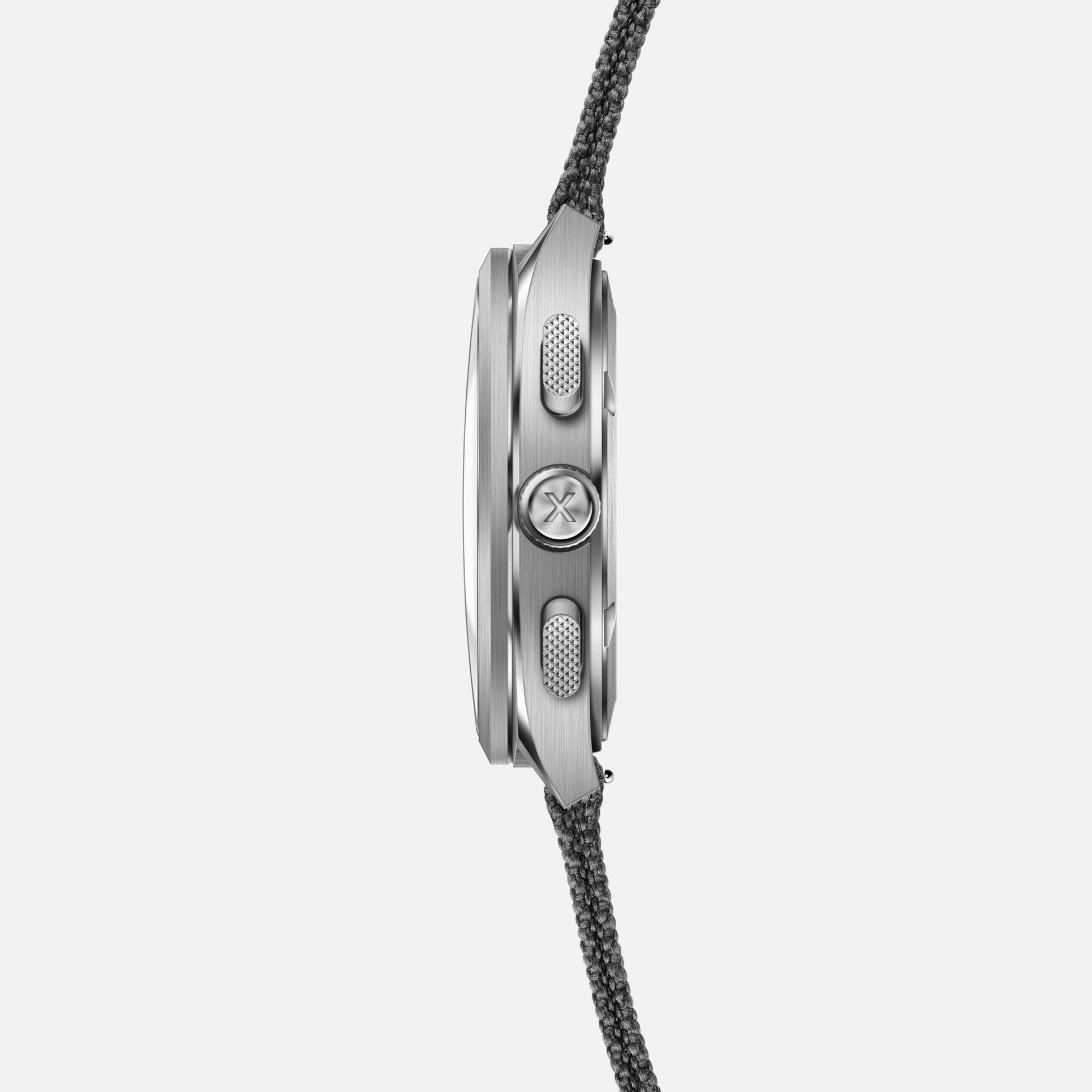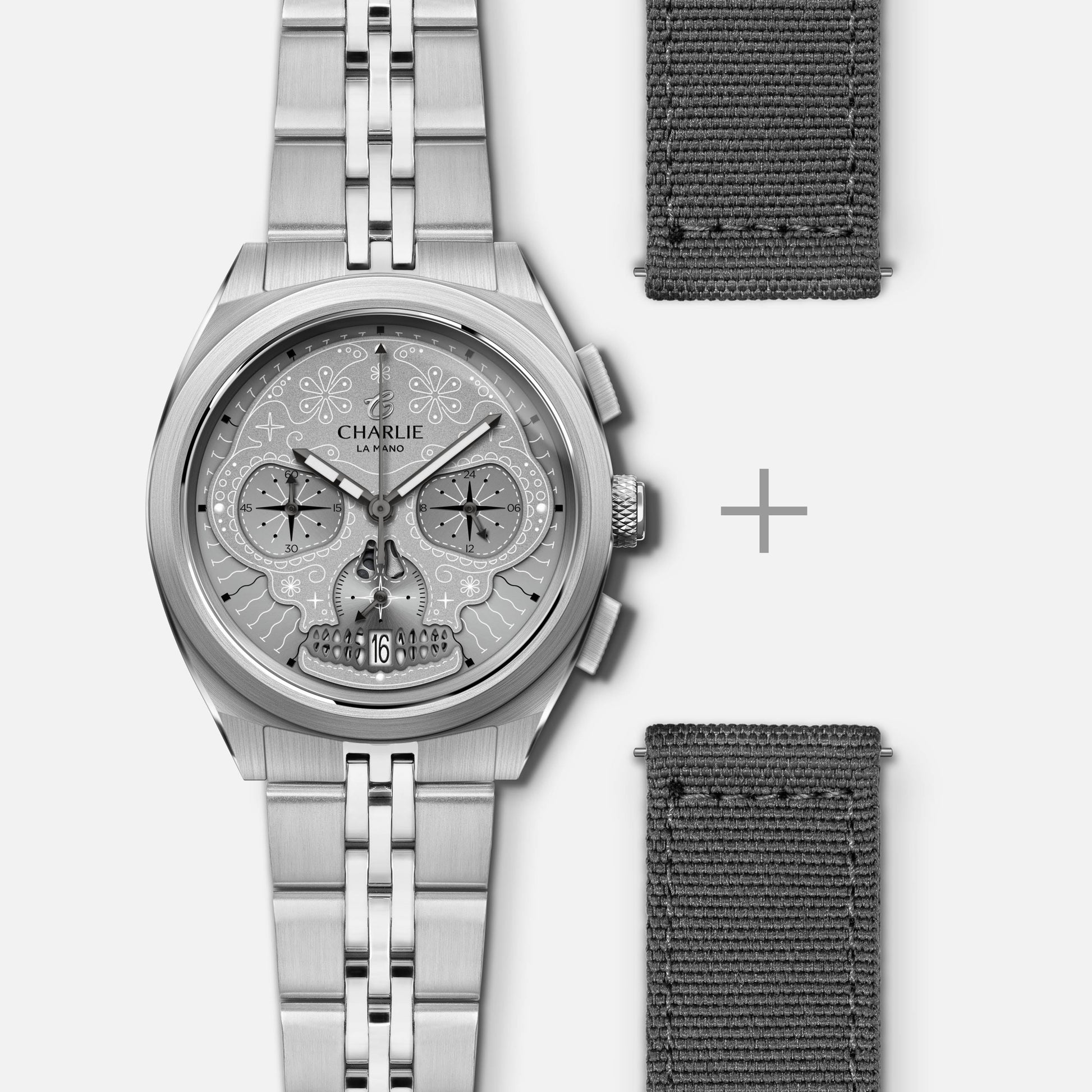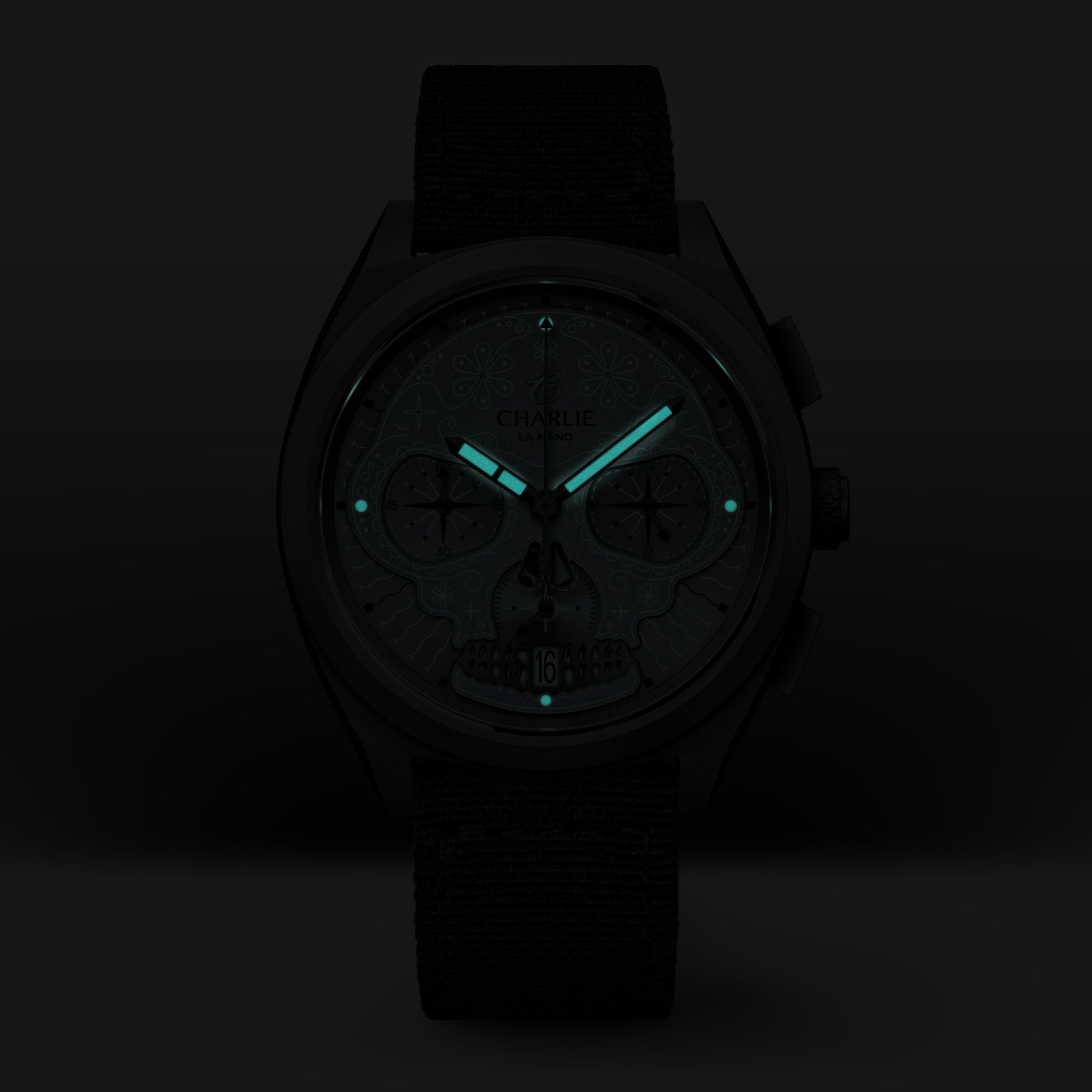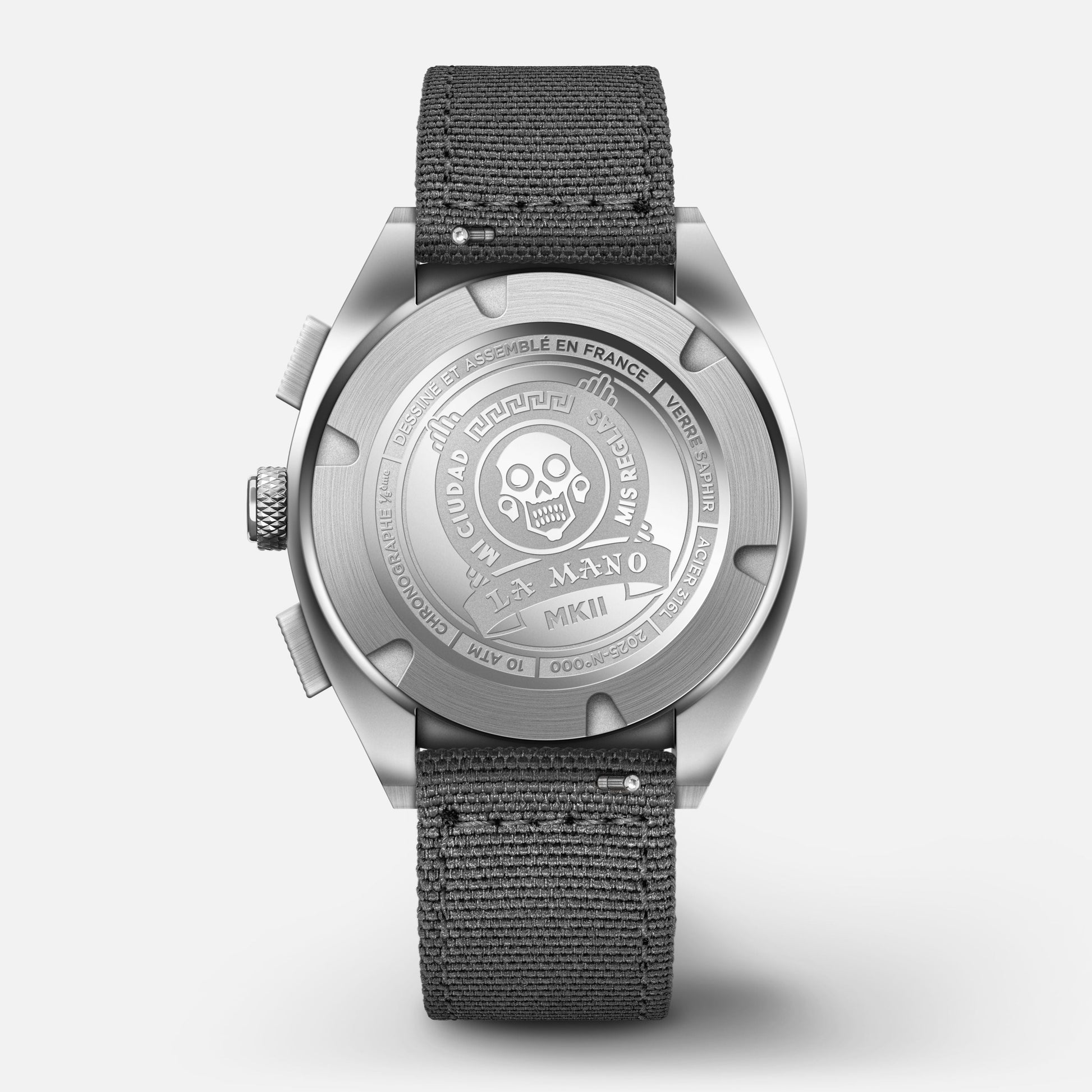 Imaginée en collaboration avec Alexclick, la "GRX - La Mano" affirme la vision contemporaine de la maison Charlie et son goût pour l'innovation créative. Le cadran illustre un graphisme inspiré des Calaveras - tête de mort mexicaine. Le crâne se dessine en volume et se sublime grâce à un ajourage laissant apparaitre la dateur à travers les dents. Le modèle doté d'un mouvement chronographe mecaquartz se compose d'un boitier de Ø39mm étanche à 10ATM, réhaussé d'un verre saphir bombé, et dévoile discrètement en fond de boîte le signe gravé La Mano.
