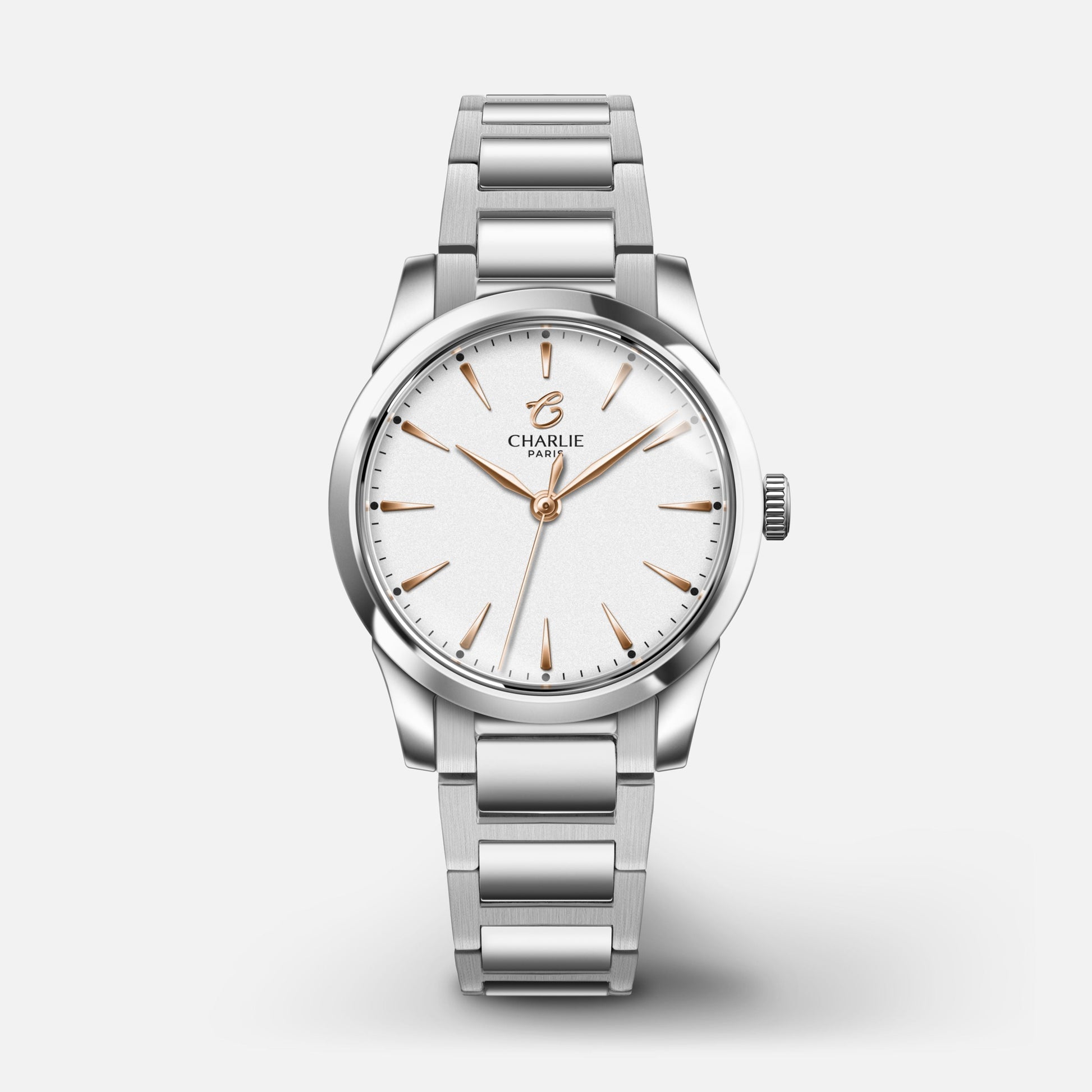 Dessinée et assemblée en France, l'Aurore avec cadran blanc et détails dorés présente des lignes épurées, au design à la fois classique et contemporain. Cette montre pour femme étanche à 100 mètres flatte les poignets féminins avec son boitier de 32mm de diamètre, son bracelet en acier et ses lignes dynamiques.