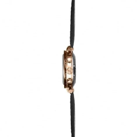 Son mouvement automatique assure une mesure du temps fluide et fiable, visible à travers un fond vitré. Le cadran noir, protégé par un verre saphir inrayable, accueille trois compteurs sportifs tandis que l’acier poli rehaussé de PVD or rose souligne chaque détail. Le bracelet en cuir de vachette embossé croco épouse le poignet avec confort et élégance, qu’il s’agisse d’une réunion en ville ou d’un week-end sur le pont d’un bateau.