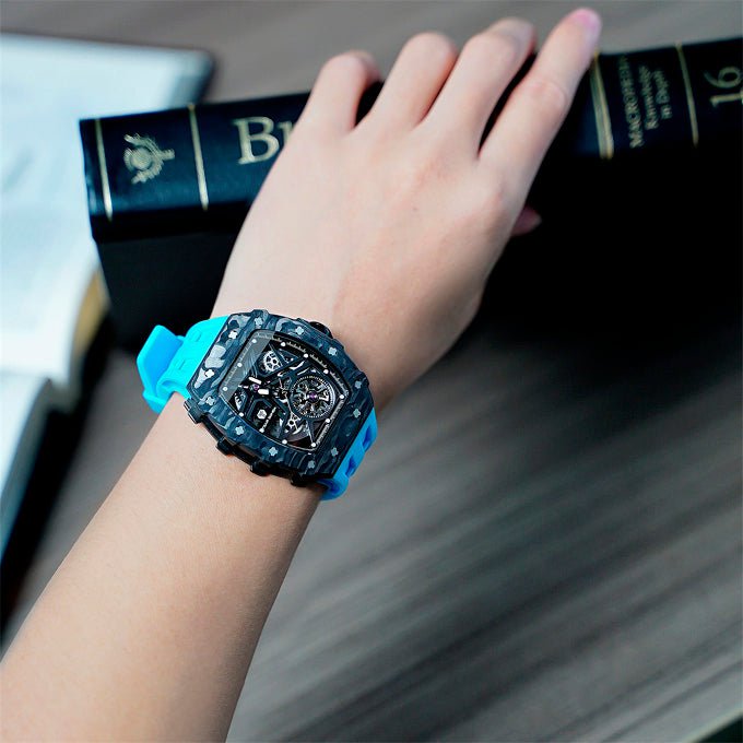 Apportez une touche de fraîcheur à votre poignet avec la Montre TSAR BOMBA Homme Elemental Automatique TB8209CF04. Son cadran squelette dévoile un mouvement automatique captivant, protégé par un verre saphir ultra résistant. La lunette en fibre de carbone et le bracelet en silicone bleu offrent un style dynamique et confortable. Étanche jusqu’à 5 ATM, elle vous suit dans toutes vos aventures. Garantie 2 ans, cette montre allie performance et originalité pour un look qui ne passe pas inaperçu !