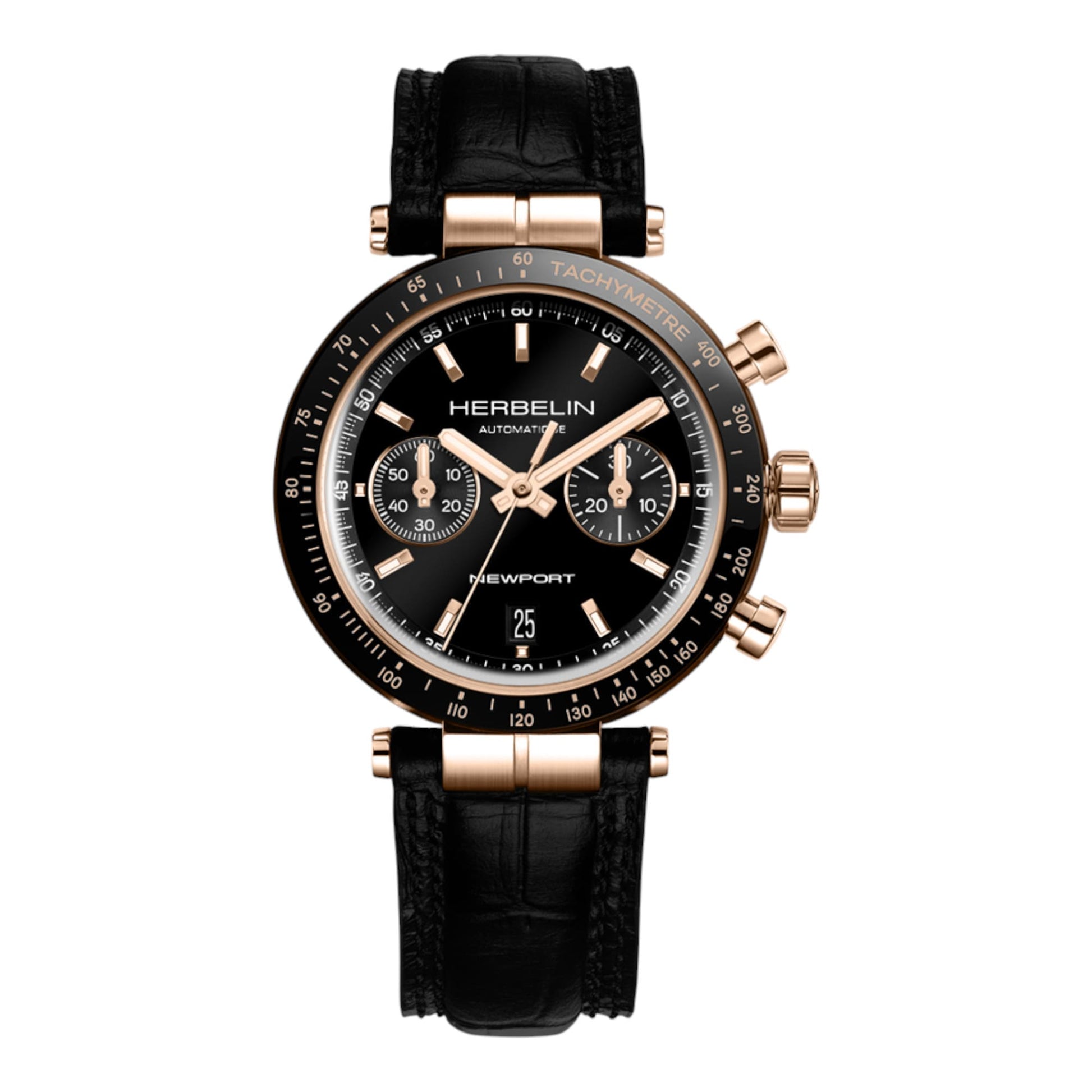 L’héritage nautique revisité en chronographe d’exception.Édition limitée : 300 exemplaires numérotés dans le monde Inspirée de l’édition anniversaire des 35 ans de la collection Newport, la Herbelin Newport Chronograph Heritage devient désormais une ligne permanente, affirmant son statut d’icône du design sportif français. Son boîtier cylindrique de 42 mm en acier inoxydable revêtu de PVD or rose évoque la version originale de 1988 tout en intégrant des finitions modernes et des performances de haute précision. La lunette en céramique noire polie, gravée d’une échelle tachymétrique, renforce son style racé. Les six vis apparentes, inspirées des winches de voiliers, rappellent subtilement l’ADN marin de la maison Herbelin, tout comme la couronne vissée ornée d’une rose des vents gravée. Le cadran noir brossé, protégé par un verre saphir antireflet, offre une lisibilité optimale. Les index facettés luminescents et les aiguilles en forme d’épée assurent une lecture claire de l’heure, complétée par une trotteuse centrale laquée blanche, un compteur 30 minutes à 3h, une petite seconde à 9h, et un guichet date finement encadré à 6h. Cette montre embarque un mouvement automatique suisse Sellita SW510 BHa, reconnu pour sa robustesse et sa précision. Ce calibre offre une réserve de marche de 62 heures, visible à travers un fond de boîte transparent, où l’on peut admirer la masse oscillante gravée Herbelin. Étanche jusqu’à 100 mètres, la Newport Chronograph Heritage se porte aussi bien au quotidien qu’en environnement formel. Son bracelet en cuir embossé noir, élégant et confortable, est équipé d’une boucle déployante sécurisée. |