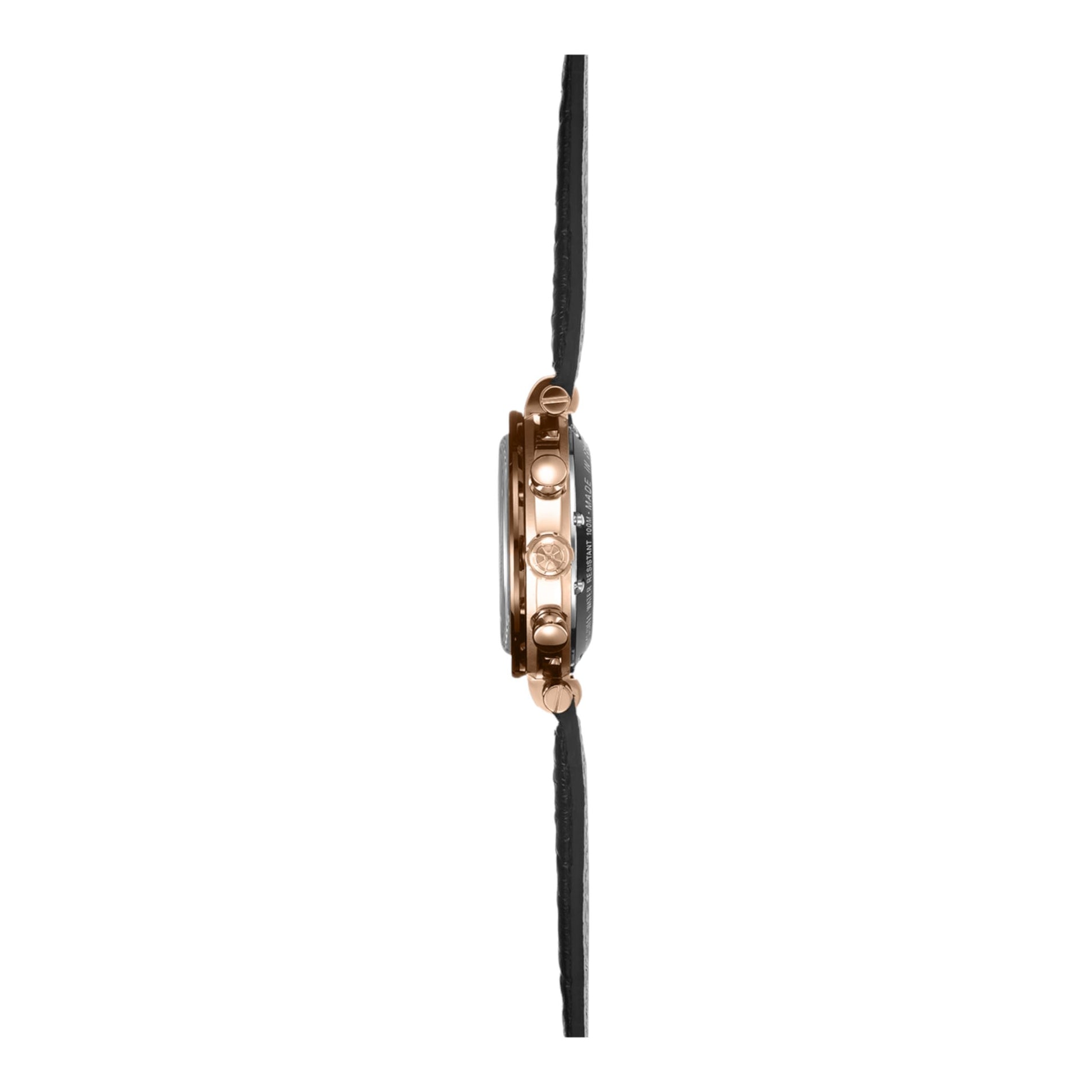Acier 316L avec traitement PVD or rose Fond de boîte : Transparent, rotor gravé Lunette : Céramique noire, gravée tachymètre |