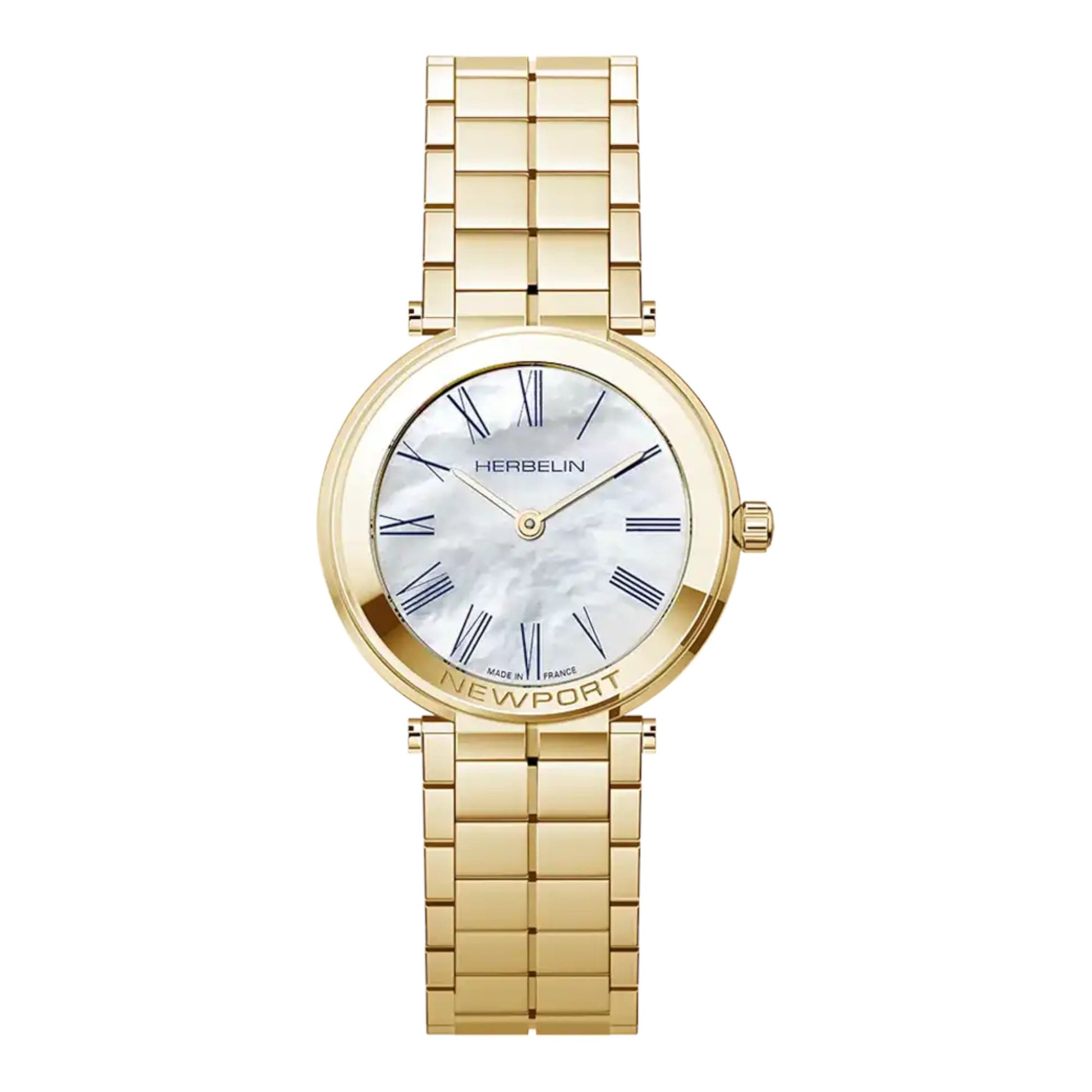 Son boîtier rond en acier inoxydable recouvert de PVD or jaune, d’un diamètre de 32 mm, sublime un somptueux cadran en nacre véritable, aux reflets naturels et changeants. Les aiguilles dorées et les index en chiffres romains bleus créent un contraste visuel raffiné, tout en assurant une lecture élégante de l’heure. La montre reprend les codes emblématiques de la collection Newport, tels que la lunette gravée et les attaches centrales inspirées des hublots marins, pour affirmer son identité horlogère. Le verre saphir inrayable garantit une excellente résistance aux rayures, tandis que l’étanchéité jusqu’à 30 mètres assure une protection au quotidien. Équipée d’un mouvement suisse à quartz Ronda 774-1, cette montre offre une précision fiable dans un format délicat. Son bracelet en acier finition PVD or jaune, associé à une boucle déployante, assure un port confortable et sécurisé avec une finition impeccable. |