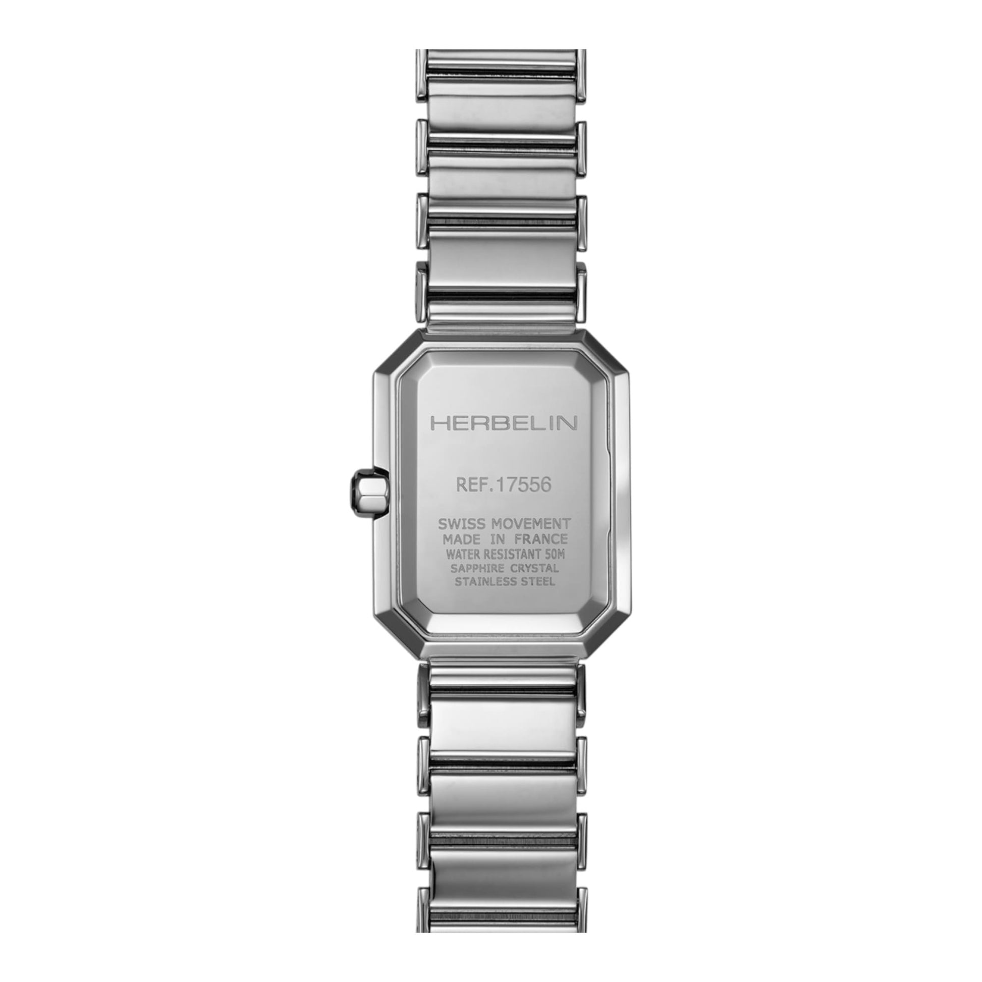 Herbelin Octogône Quartz Nacre Noire & Acier – L’élégance graphique au service du caractèreEntre audace contemporaine et raffinement horloger, la montre Herbelin Octogône Quartz Nacre Noire & Acier incarne une vision affirmée de la féminité. Son design structuré, porté par un boîtier octogonal en acier 316L et un bracelet facetté au poli miroir, célèbre l’alliance parfaite entre lignes tendues et élégance sculpturale. Un cadran envoûtant en nacre noireAu cœur de cette création se trouve un cadran en nacre noire véritable, d’une intensité rare. Ses reflets profonds et changeants capturent la lumière avec une subtilité presque hypnotique. Chaque détail évoque la modernité et la finesse : index facettés en acier, géométrie harmonieuse, finitions irréprochables. Un profil fin, une présence marquéeAvec son profil ultra-plat de seulement 7,2 mm, cette montre épouse parfaitement le poignet. Le mouvement à quartz suisse, discret mais d’une précision remarquable, anime le modèle avec fiabilité. Le verre saphir inrayable et une étanchéité jusqu’à 50 mètres viennent parfaire l’ensemble, assurant une durabilité à la hauteur de son design. Un bijou de caractère pour femmes affirméesLa Herbelin Octogône Nacre Noire & Acier s’adresse à celles qui veulent conjuguer esthétique contemporaine, élégance précieuse et personnalité affirmée. Une montre-bijou, conçue comme une œuvre graphique, pour sublimer chaque geste avec force et distinction. Octogône par Herbelin : quand la rigueur du design rencontre l’émotion des matières. |