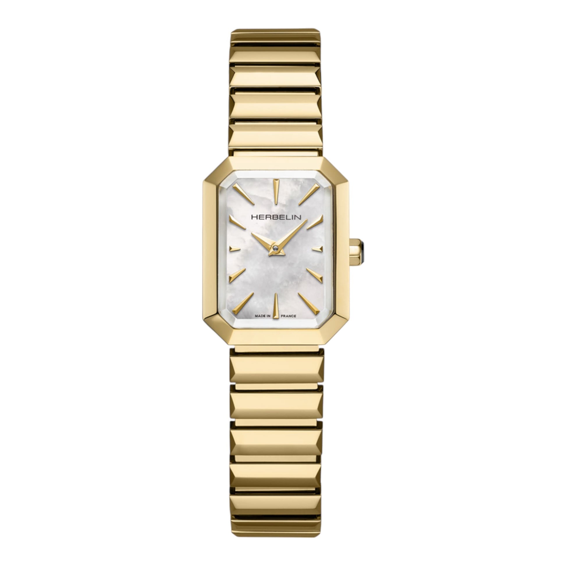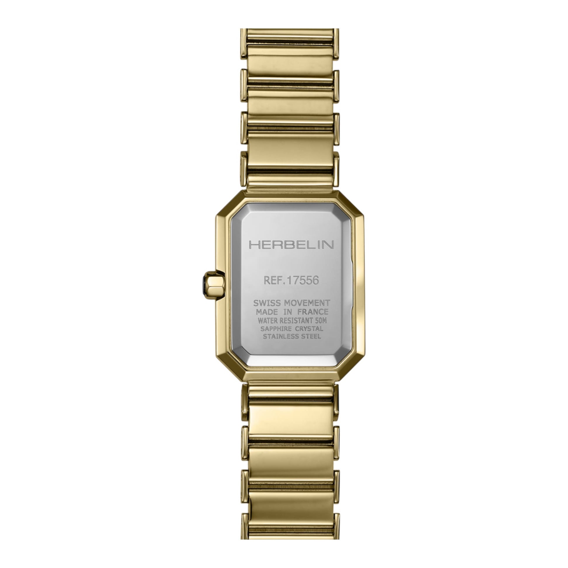 Herbelin Octogône Quartz Nacre Blanche & PVD Or Jaune – Élégance contrastée, esprit bijouSingulière et captivante, la montre Herbelin Octogône Quartz Nacre Blanche & PVD Or Jaune incarne un jeu subtil de contrastes entre intensité et éclat. Fidèle à l’esprit de la Maison Herbelin, elle marie géométrie architecturale et raffinement contemporain dans un format idéal pour les poignets féminins. Son boîtier octogonal en acier inoxydable est sublimé par un placage PVD or jaune, parfaitement assorti à un bracelet facetté aux finitions miroir. Ce duo sophistiqué encadre un cadran en nacre noire véritable, riche en reflets profonds et mystérieux. Les index dorés facettés renforcent l’allure graphique de la montre tout en apportant une touche précieuse. Avec son profil ultra-fin de 7,2 mm, ce garde-temps se porte avec élégance et légèreté. Il est animé par un mouvement à quartz suisse Ronda, reconnu pour sa précision, et protégé par un verre saphir inrayable. Son étanchéité jusqu’à 50 mètres garantit fiabilité au quotidien. Élégante, graphique et lumineuse, la Herbelin Octogône Nacre Noire & PVD Or Jaune est bien plus qu’une montre : un véritable bijou de caractère pour femmes affirmées. |