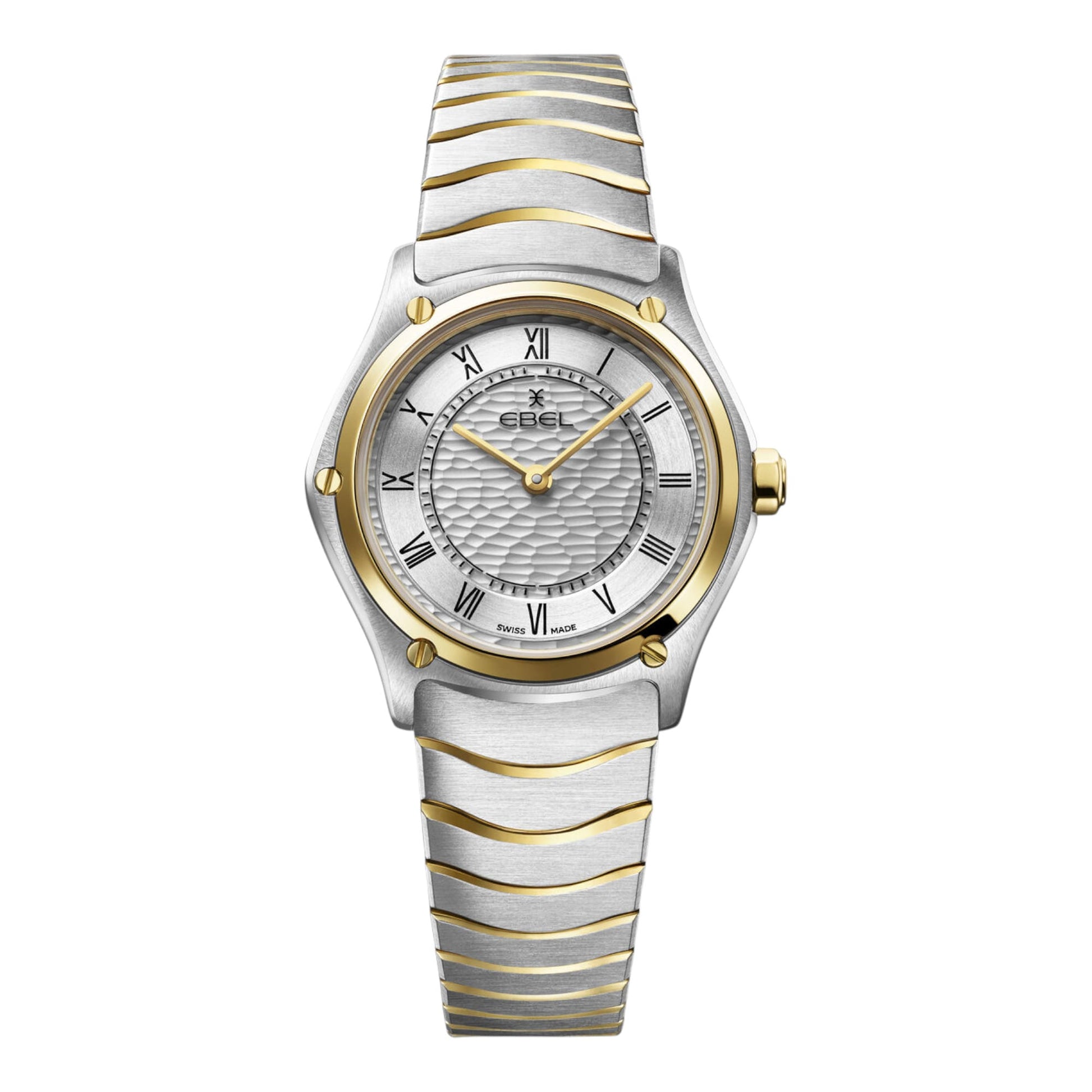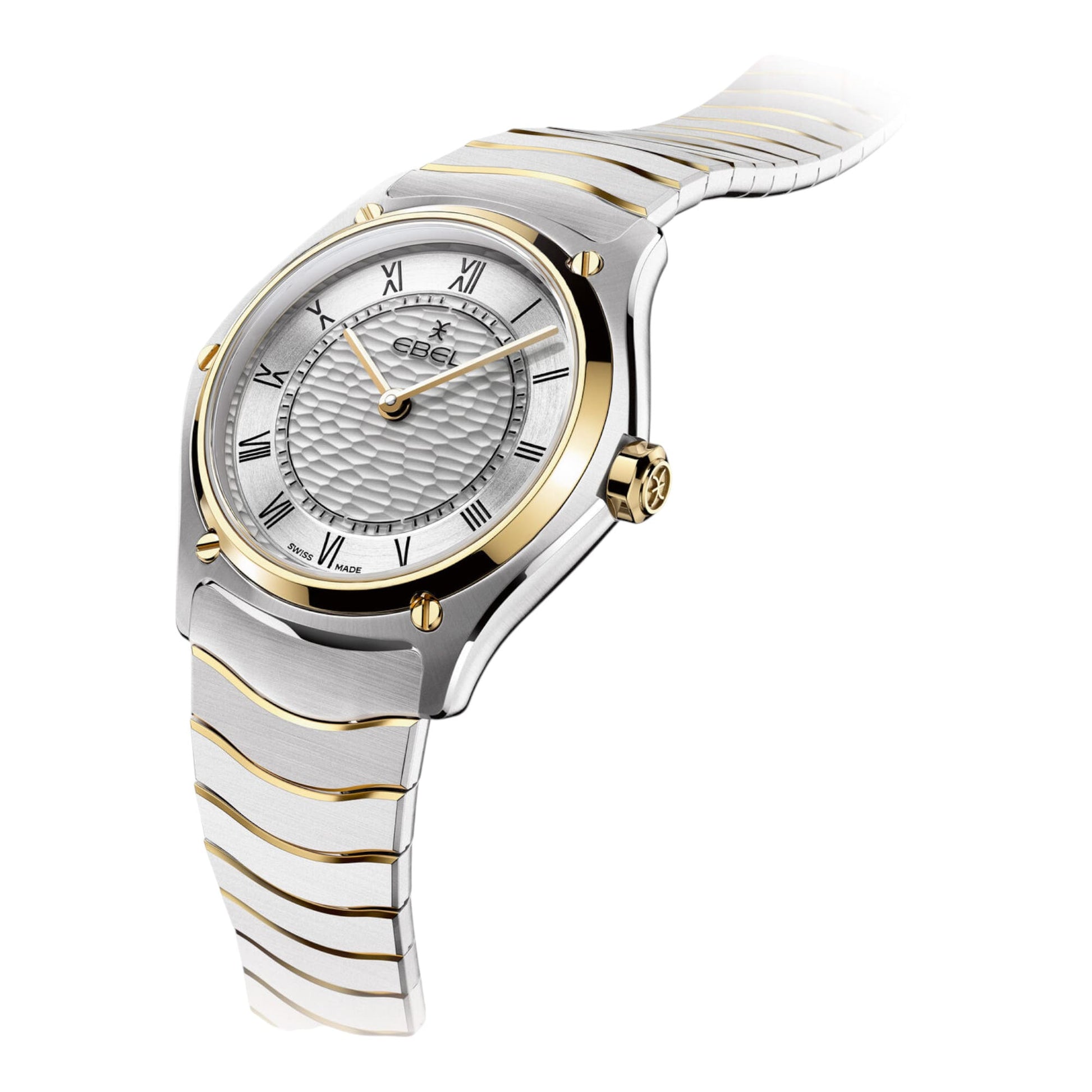 Découvrez la montre femme EBEL Sport Classic, un modèle élégant avec boîtier en acier inoxydable et or jaune 18K, Ø 29mm. Cadran argenté blanc avec chiffres romains noirs, bracelet à maillons ondulés bicolores et mouvement quartz suisse. Étanchéité jusqu’à 5 bar. • Boîtier : Acier inoxydable et or jaune 18K, diamètre de 29mm. La montre femme EBEL Sport Classic est un chef-d’œuvre d’élégance et de sophistication. Avec son boîtier en acier inoxydable et or jaune 18K de 29mm de diamètre, elle allie la robustesse de l’acier à la luxueuse chaleur de l’or. Le cadran argenté blanc est orné de chiffres romains gravés et peints en noir, ajoutant une touche classique et intemporelle à l’ensemble. Le motif texturé en vagues sur le cadran apporte une dimension supplémentaire à son design. Le bracelet en acier inoxydable bicolore à maillons ondulés est à la fois élégant et confortable, complété par un fermoir à clip pour une sécurité optimale. Le cristal de saphir avec traitement antireflet sous-jacent assure une lisibilité parfaite en toutes circonstances. Propulsée par un mouvement quartz suisse, cette montre garantit une précision sans faille. De plus, son étanchéité jusqu’à 5 bar la rend idéale pour une utilisation quotidienne, y compris lors de vos activités aquatiques. • Élégance : Design sophistiqué avec boîtier en acier inoxydable et or jaune 18K. La montre EBEL Sport Classic est le compagnon idéal pour la femme moderne qui recherche une touche d’élégance dans son quotidien. Que vous soyez au bureau, en soirée ou en promenade, cette montre ajoutera une note de sophistication à toutes vos tenues. |