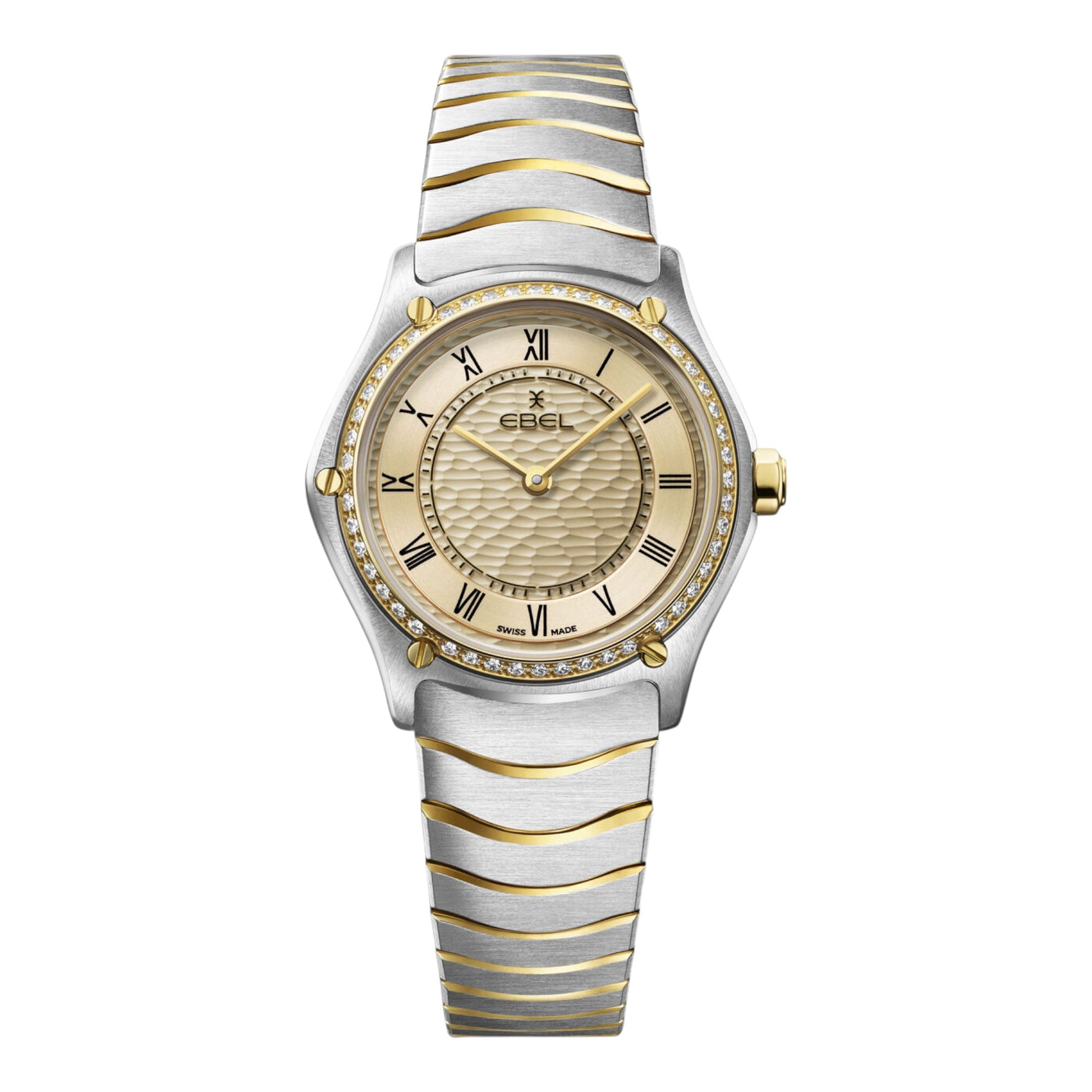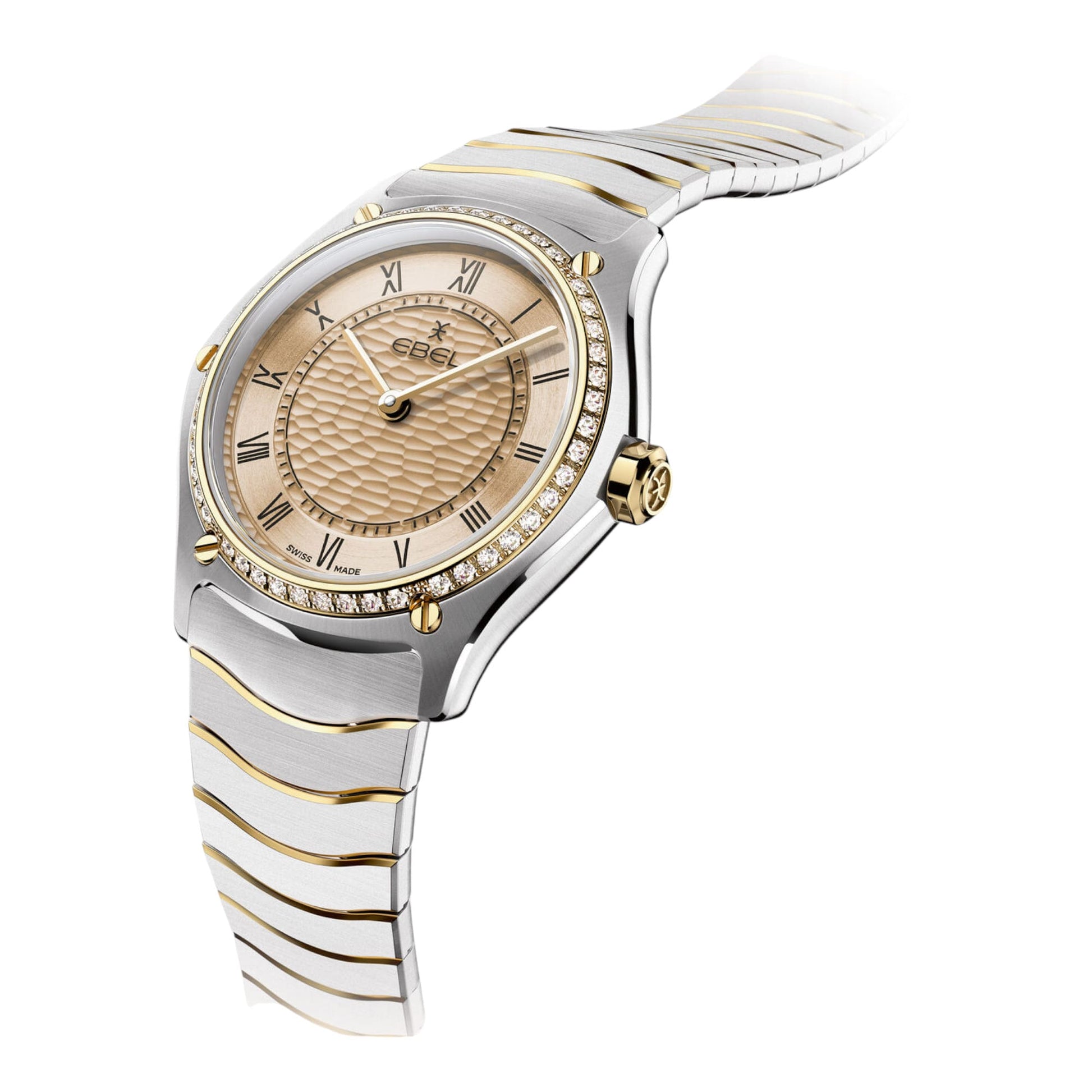Découvrez la montre femme EBEL Sport Classic, un modèle élégant avec boîtier en acier inoxydable et or jaune 18K serti de 47 diamants (0.3055ct), Ø 29mm. Cadran beige clair avec chiffres romains noirs, bracelet à maillons ondulés bicolores et mouvement quartz suisse. Étanchéité jusqu’à 5 bar. • Boîtier : Acier inoxydable et or jaune 18K serti de 47 diamants (0.3055ct), diamètre de 29mm. Description :La montre femme EBEL Sport Classic est un chef-d’œuvre d’élégance et de sophistication, rehaussée par la présence de 47 diamants (0.3055ct) sur son boîtier en acier inoxydable et or jaune 18K de 29mm de diamètre. Ce modèle allie la robustesse de l’acier à la luxueuse chaleur de l’or, tout en ajoutant une touche de glamour grâce aux diamants sertis. Le cadran beige clair est orné de chiffres romains gravés et peints en noir, ajoutant une touche classique et intemporelle à l’ensemble. Le motif texturé en vagues sur le cadran apporte une dimension supplémentaire à son design. Le bracelet en acier inoxydable bicolore à maillons ondulés est à la fois élégant et confortable, complété par un fermoir à clip pour une sécurité optimale. Le cristal de saphir avec traitement antireflet sous-jacent assure une lisibilité parfaite en toutes circonstances. Propulsée par un mouvement quartz suisse, cette montre garantit une précision sans faille. De plus, son étanchéité jusqu’à 5 bar la rend idéale pour une utilisation quotidienne, y compris lors de vos activités aquatiques. •Élégance : Design sophistiqué avec boîtier en acier inoxydable et or jaune 18K serti de diamants. La montre EBEL Sport Classic est le compagnon idéal pour la femme moderne qui recherche une touche d’élégance et de luxe dans son quotidien. Que vous soyez au bureau, en soirée ou en promenade, cette montre ajoutera une note de sophistication et de glamour à toutes vos tenues. |
