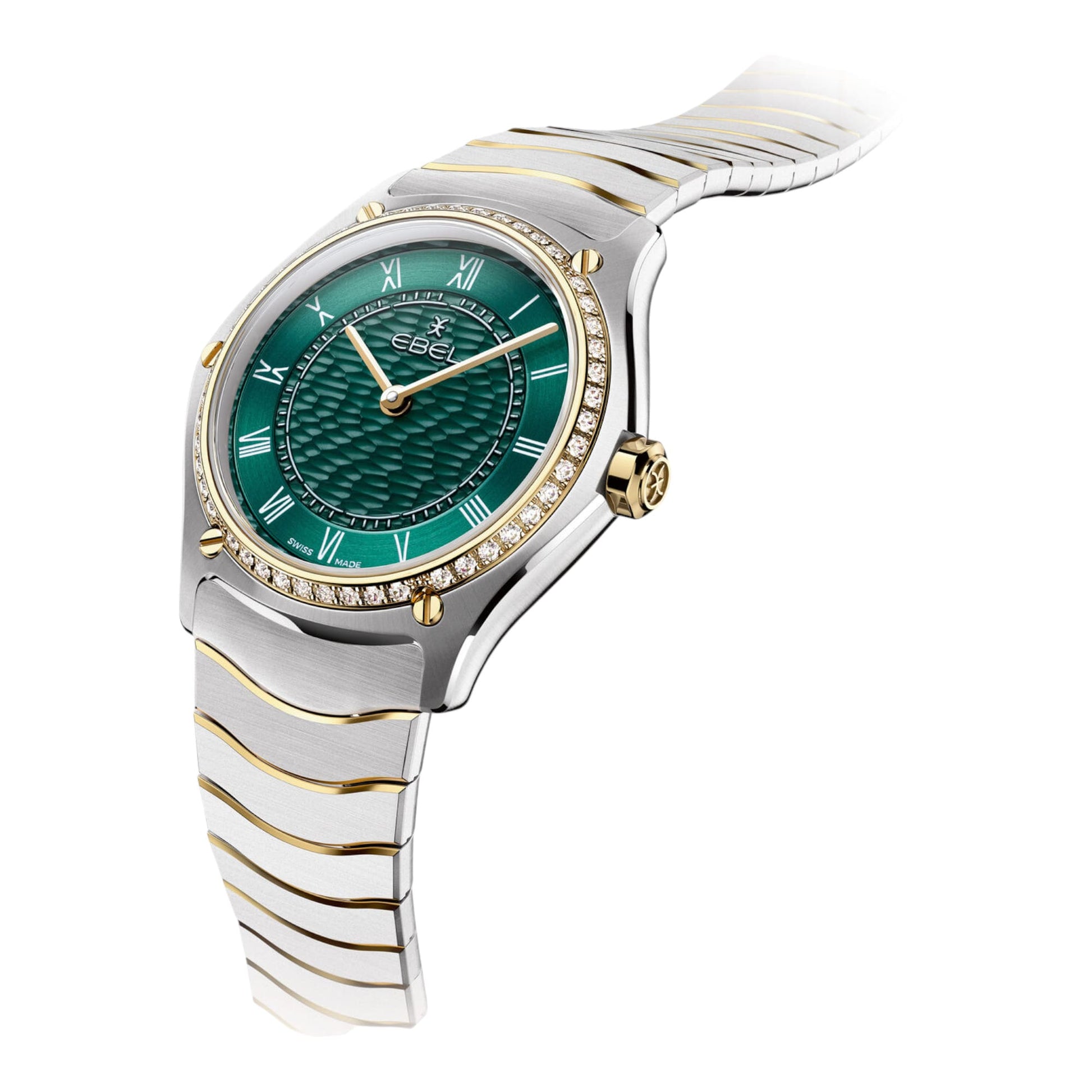 Découvrez la montre femme EBEL Sport Classic, un modèle élégant avec boîtier en acier inoxydable et or jaune 18K serti de 47 diamants (0.3055ct), Ø 29mm. Cadran vert foncé avec chiffres romains noirs, bracelet à maillons ondulés bicolores et mouvement quartz suisse. Étanchéité jusqu’à 5 bar. • Boîtier : Acier inoxydable et or jaune 18K serti de 47 diamants (0.3055ct), diamètre de 29mm. Description :La montre femme EBEL Sport Classic est un chef-d’œuvre d’élégance et de sophistication, rehaussée par la présence de 47 diamants (0.3055ct) sur son boîtier en acier inoxydable et or jaune 18K de 29mm de diamètre. Ce modèle allie la robustesse de l’acier à la luxueuse chaleur de l’or, tout en ajoutant une touche de glamour grâce aux diamants sertis. Le cadran vert foncé est orné de chiffres romains gravés et peints en blanc, ajoutant une touche classique et intemporelle à l’ensemble. Le motif texturé en vagues sur le cadran apporte une dimension supplémentaire à son design. Le bracelet en acier inoxydable bicolore à maillons ondulés est à la fois élégant et confortable, complété par un fermoir à clip pour une sécurité optimale. Le cristal de saphir avec traitement antireflet sous-jacent assure une lisibilité parfaite en toutes circonstances. Propulsée par un mouvement quartz suisse, cette montre garantit une précision sans faille. De plus, son étanchéité jusqu’à 5 bar la rend idéale pour une utilisation quotidienne, y compris lors de vos activités aquatiques. •Élégance : Design sophistiqué avec boîtier en acier inoxydable et or jaune 18K serti de diamants. La montre EBEL Sport Classic est le compagnon idéal pour la femme moderne qui recherche une touche d’élégance et de luxe dans son quotidien. Que vous soyez au bureau, en soirée ou en promenade, cette montre ajoutera une note de sophistication et de glamour à toutes vos tenues. |