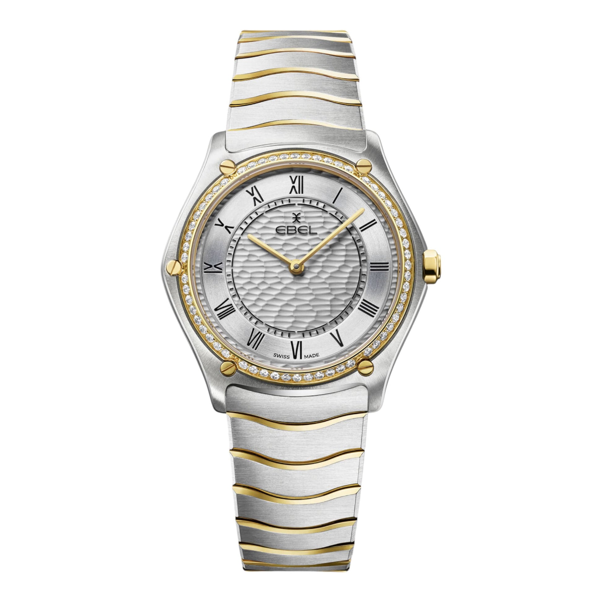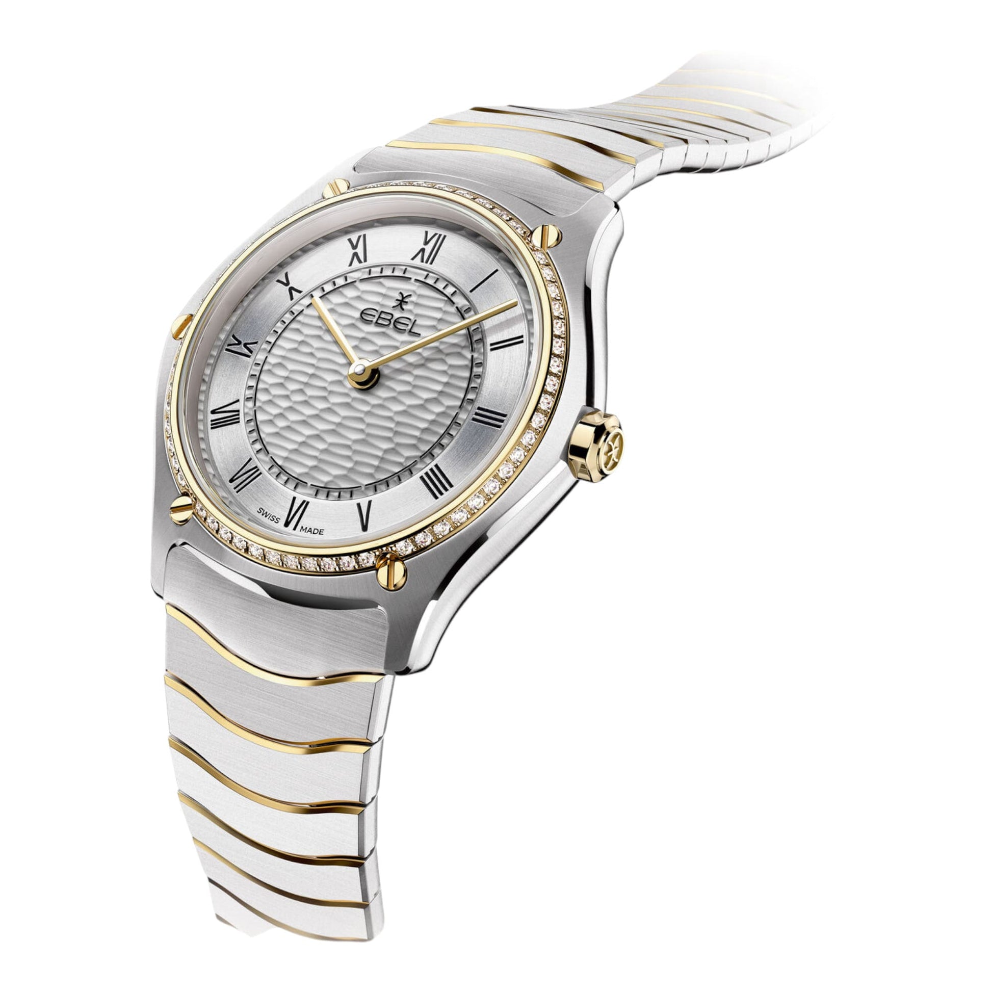 La montre EBEL Sport Classic pour femme se distingue par son boîtier en acier inoxydable de 33 mm, mettant en valeur un cadran nacre blanche pour une touche d’élégance intemporelle. Dotée d’une glace saphir avec traitement antireflet en dessous, elle garantit une lisibilité parfaite en toutes circonstances. Le bracelet en acier inoxydable à maillons en vague, avec sa boucle déployante, complète ce modèle au design raffiné. Animée par un mouvement quartz suisse, elle est étanche jusqu'à 5 bars. | |