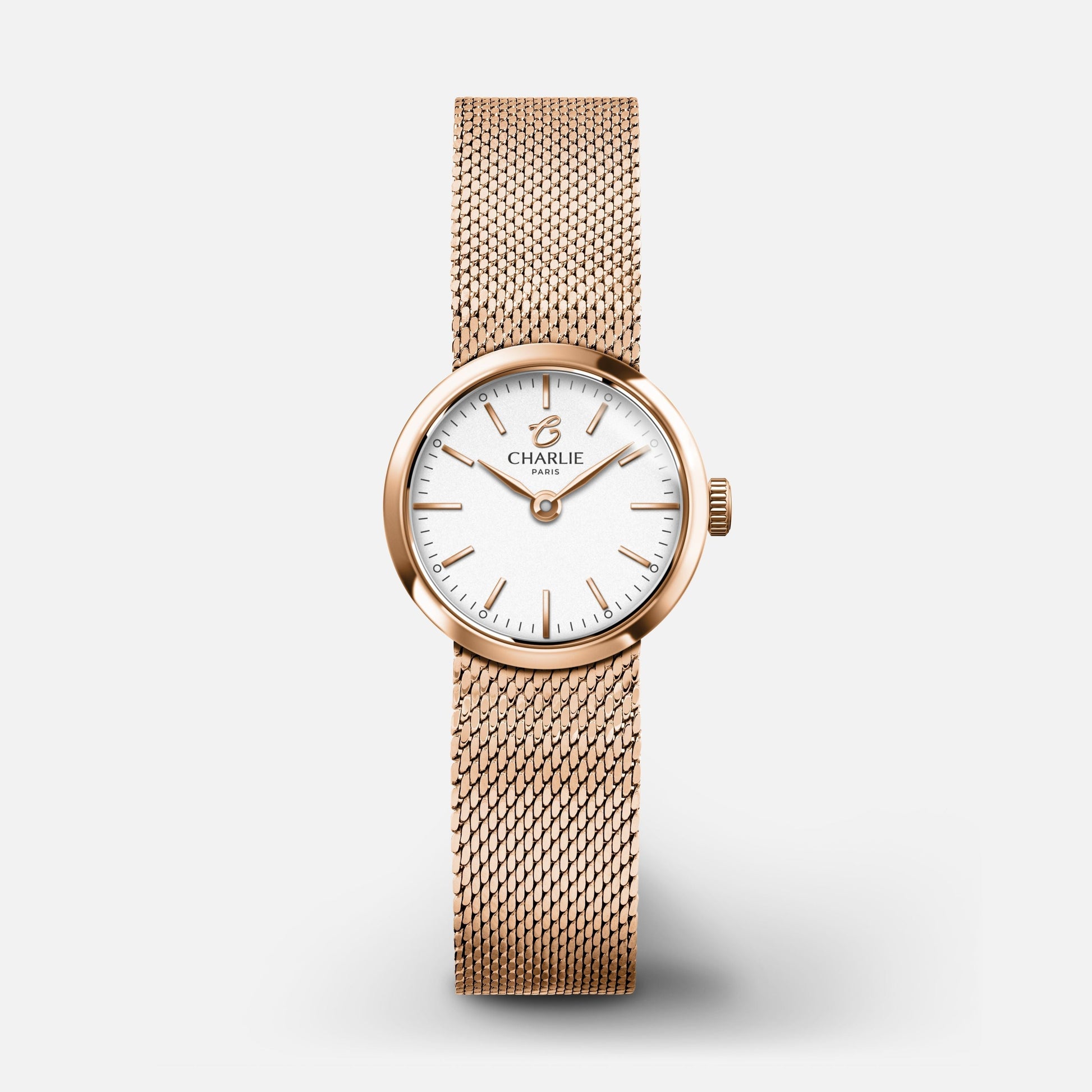 Dessinée et assemblée en France, la Sully Mini Dorée Rose présente des lignes épurées, au design à la fois classique et contemporain. Cette petite montre femme est dotée d'un mouvement à quartz parfaitement logé dans un boîtier de 24mm de diamètre d’une grande finesse.
