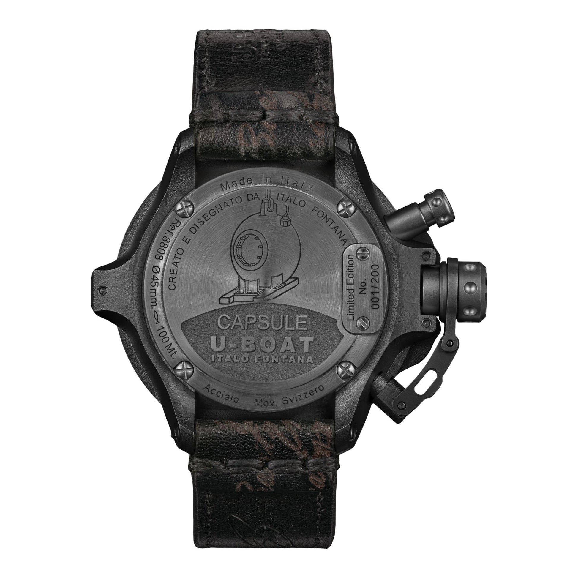 Découvrez le modèle CAPSULE 45MM PVD BK BL, une édition limitée à seulement 200 pièces avec un boîtier de 45 mm en acier inoxydable AISI 316L traité PVD, inspiré des bathysphères des années 1930. Cette montre présente une esthétique steampunk rappelant les mondes sous-marins imaginaires de Jules Verne. Le mouvement de cette montre est un Sellita SW 200 mécanique automatique suisse, personnalisé selon les spécifications U-BOAT. Il offre une fréquence de 28 800 vibrations par heure, une réserve de marche de 41 heures, 26 rubis et un rotor squelettisé. Les fonctions incluent l’affichage des heures, des minutes, des secondes, la date et un couvercle de couronne. Le boîtier, d’un diamètre de 45 mm, est en acier inoxydable AISI 316L avec un traitement PVD ultérieur et une fenêtre latérale ronde en saphir. Une protection de couronne brevetée se trouve sur le côté gauche, et un levier avec un système d’extraction de la couronne breveté est positionné à 10 heures. Le dos de la montre présente une gravure laser et est scellé avec quatre vis externes. Une plaque de série est vissée, garantissant l’authenticité de chaque pièce. Le cadran présente trois cadrans superposés en métal noir avec une ouverture visible sur le levier. Les index et les chiffres en métal brossé sont traités avec du superluminova bleu, et les aiguilles en métal peint sont également traitées avec du superluminova bleu. Le verre est en cristal de saphir bombé de haute qualité avec un traitement anti-reflet, offrant une résistance et une clarté exceptionnelles. Avec une étanchéité de 100 mètres (10 ATM), cette montre est idéale pour une utilisation quotidienne, y compris lors d’activités aquatiques légères. Le bracelet est en cuir de veau noir, découpé au laser et fabriqué à la main selon des techniques artisanales traditionnelles pour lui conférer un aspect et une sensation vieillis naturels. Les finitions noires sont réalisées avec du coton ciré. Sa largeur est de 23/22 mm (réf. 9385/Z), et il est équipé d’une boucle ardillon en acier avec un traitement PVD ultérieur . |