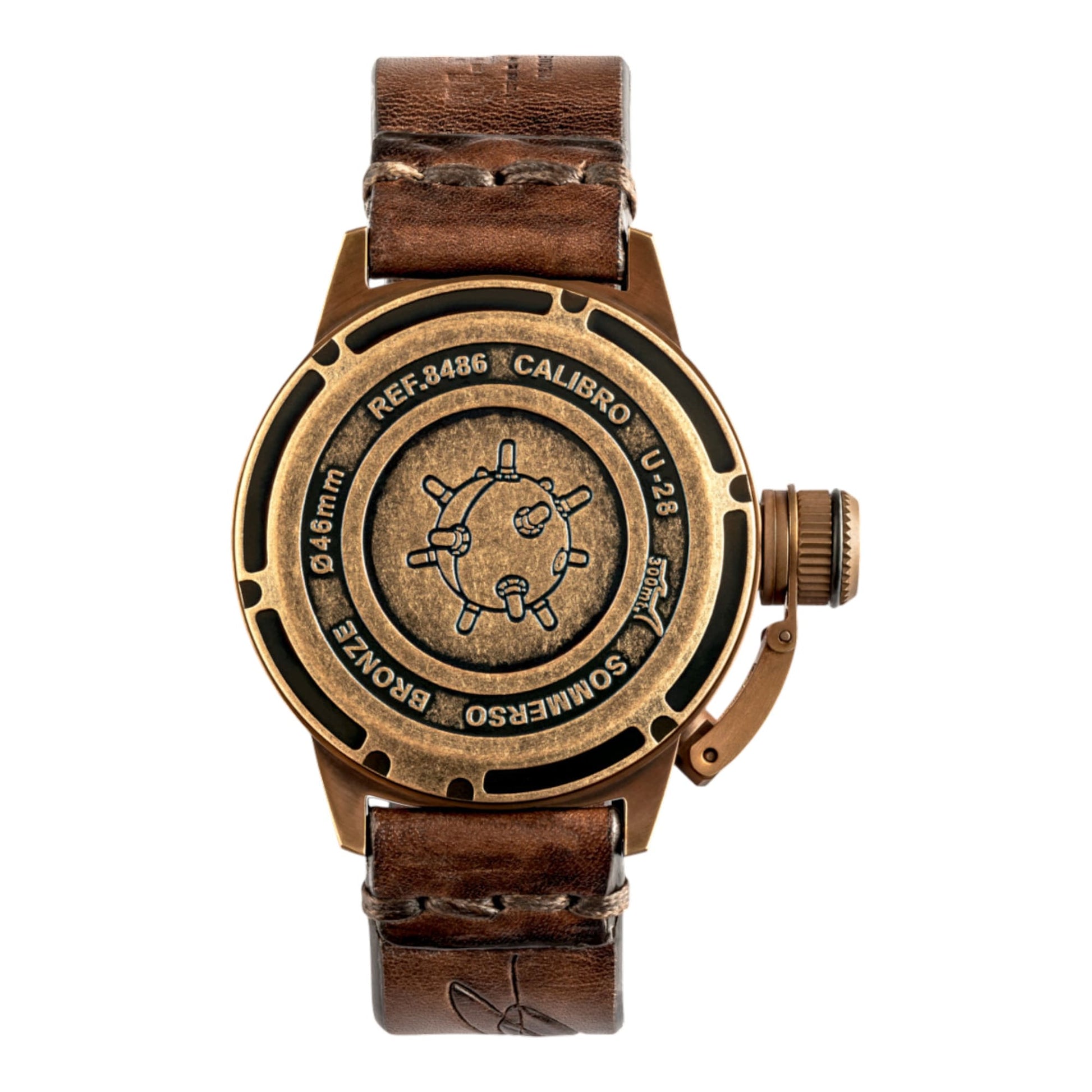 Découvrez le modèle SOMMERSO 46MM BRONZO, une montre de plongée professionnelle qui combine les nuances uniques du bronze naturel avec des spécifications techniques de pointe. Ce modèle est animé par un mouvement mécanique automatique suisse Sellita SW 200, personnalisé selon les spécifications U-BOAT, avec une fréquence de 28 800 vibrations par heure, une réserve de marche de 41 heures, 26 rubis et un rotor squelettisé. Les fonctions de la montre incluent l’affichage de la date, des heures, des minutes, des secondes et un indicateur 24h. Le cadran est équipé d’une lunette unidirectionnelle graduée et d’une couronne vissée pour une meilleure étanchéité. Le boîtier, d’un diamètre de 46 mm, est en bronze naturellement vieilli, avec une couronne distinctive sur le côté gauche protégée par un dispositif breveté. Une plaque avec le numéro de série est fixée sur le côté gauche du boîtier, garantissant l’authenticité de chaque pièce. Le dos de la montre est également en bronze avec un traitement anticorrosion spécial antiqué, et il est scellé par vis. Le cadran présente trois couches superposées, la couche supérieure étant en noir avec un rubis visible. Les aiguilles, les chiffres et les marqueurs lumineux sont traités avec du superluminova de couleur beige pour une lisibilité optimale dans l’obscurité, tandis que l’aiguille 24h est en rouge. Le verre est en cristal de saphir avec un revêtement anti-reflet, offrant une résistance et une clarté exceptionnelles. Avec une étanchéité de 300 mètres (30 ATM), cette montre est parfaitement adaptée aux plongées professionnelles. Le bracelet est en cuir de veau brun foncé, fabriqué et fini à la main, offrant un confort et un style exceptionnels. Sa largeur est de 22/20 mm , et il est équipé d’une boucle ardillon en bronze avec un traitement anticorrosion spécial antiqué . Les nuances uniques du bronze naturel, combinées aux spécifications techniques pour la plongée professionnelle, sont les principales caractéristiques de cette montre de plongée au design exubérant. |